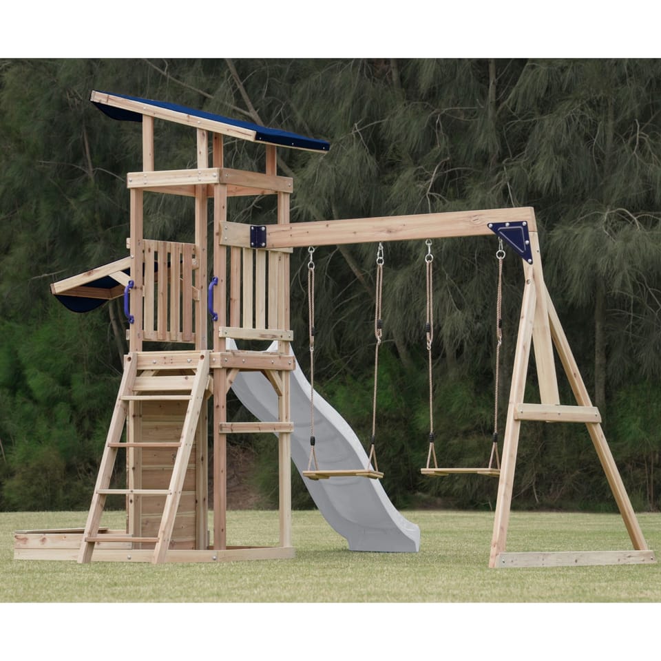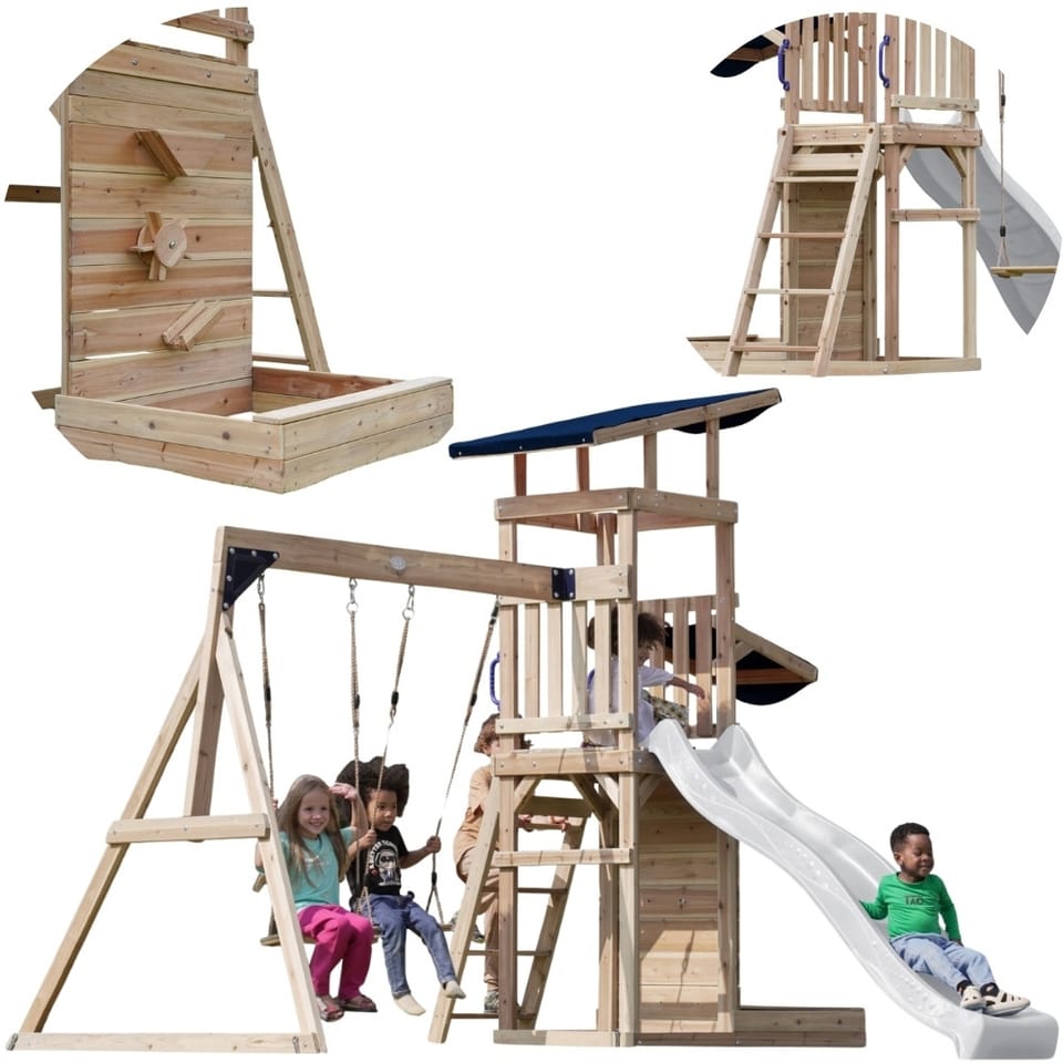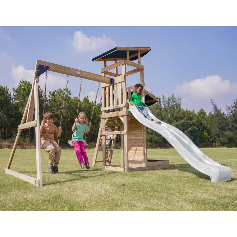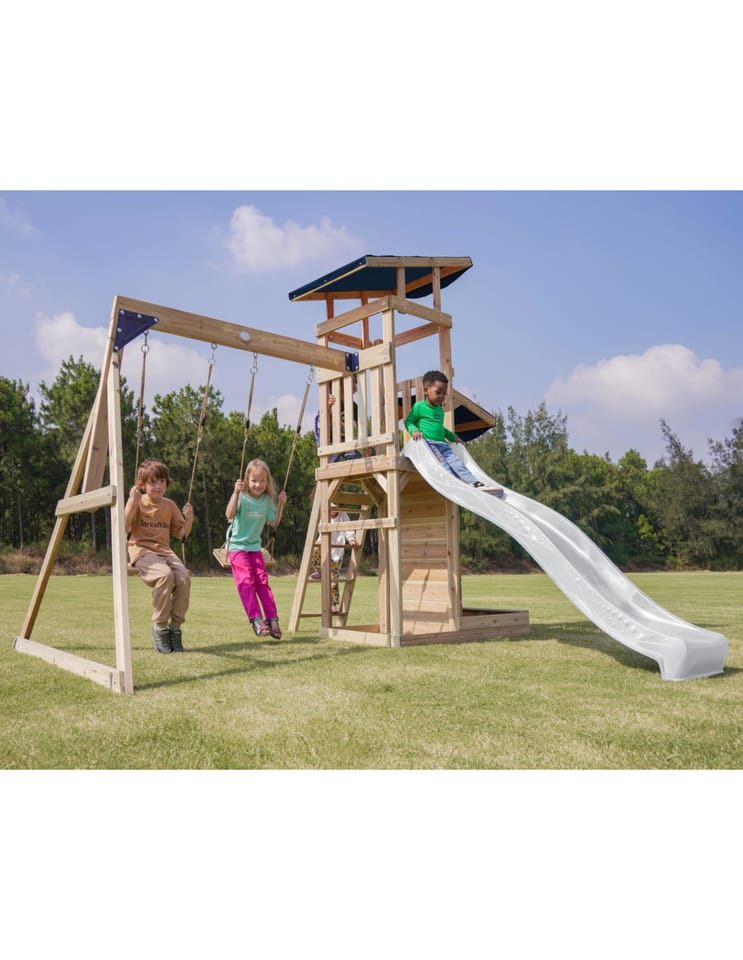 ✔ Dzięki różnorodnym elementom – wieży widokowej, długiej zjeżdżalni, podwójnej huśtawce i piaskownicy – dzieci mogą rozwijać swoją kreatywność, siłę i koordynację ruchową w jednym miejscu!