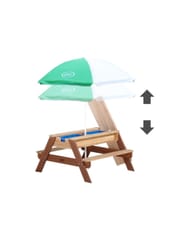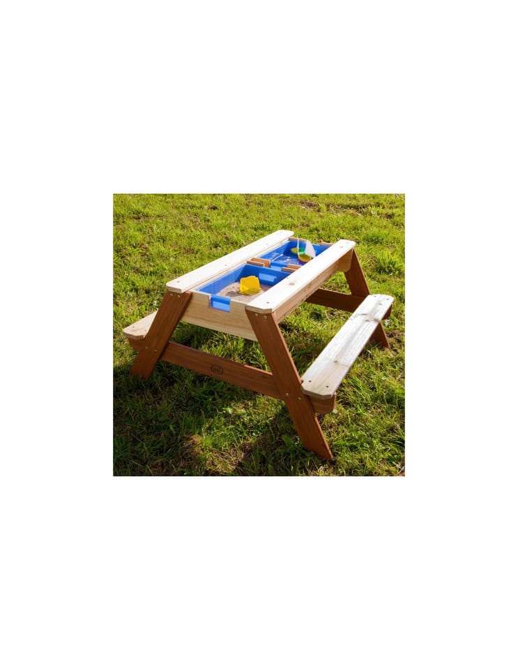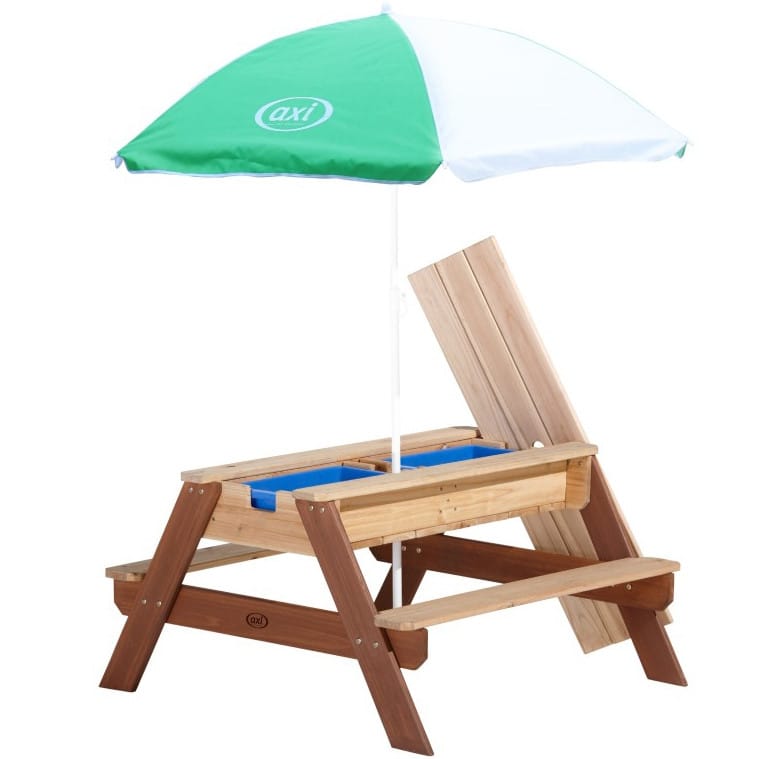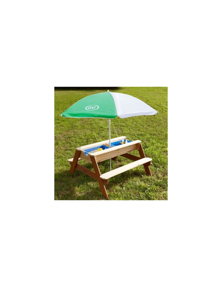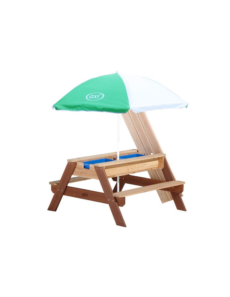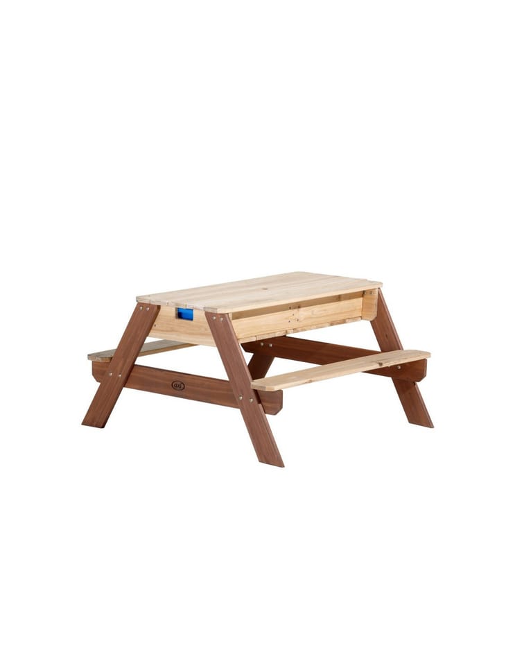 Stół piknikowy Nick od renomowanej marki AXI to wielofunkcyjny stół, który ma tajne pomieszczenie z dwoma niebieskimi pojemnikami pod zdejmowanym blatem. Te niebieskie pojemniki można wypełnić piaskiem i/lub wodą, ale oczywiście można w nich przechowywać również zabawki. Dodatkowo pojemniki są wyjmowane, dzięki czemu można je łatwo wyczyścić. Klasyczne połączenie piasku i wody zawsze sprawdza się u dzieci! W mgnieniu oka zamienisz stół z piaskiem i wodą w stół piknikowy, na którym dzieci będą mogły tworzyć, rysować lub cieszyć się smakołykami.