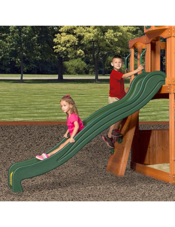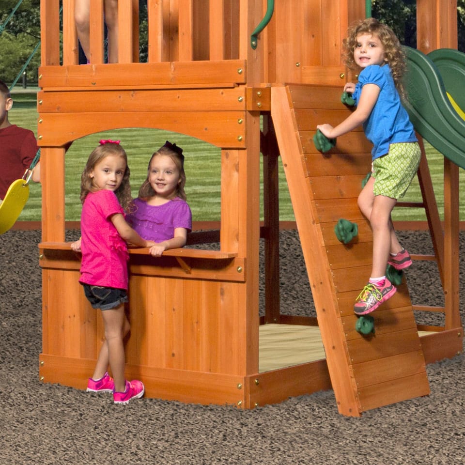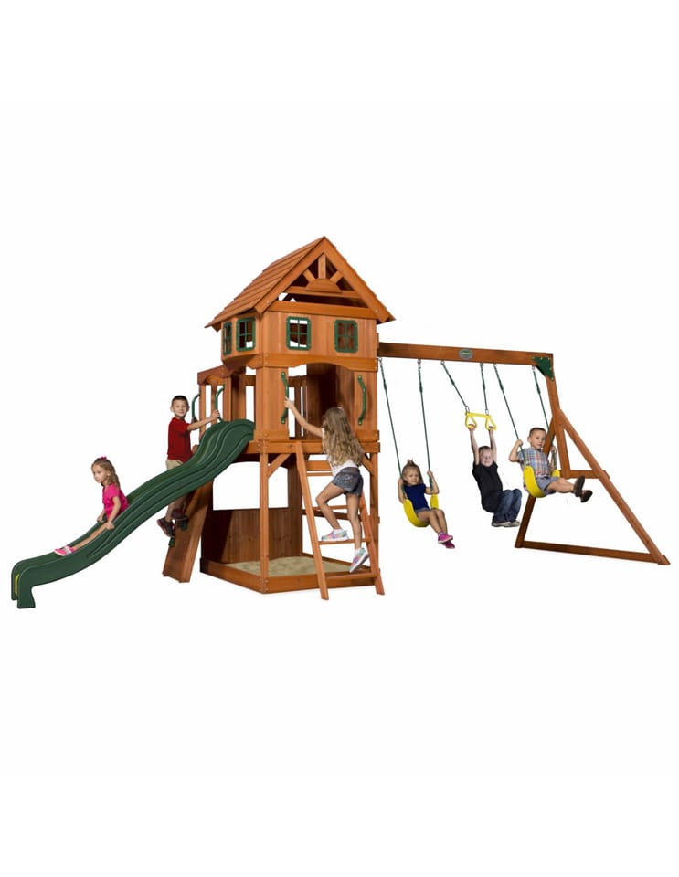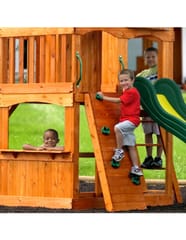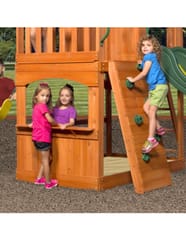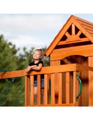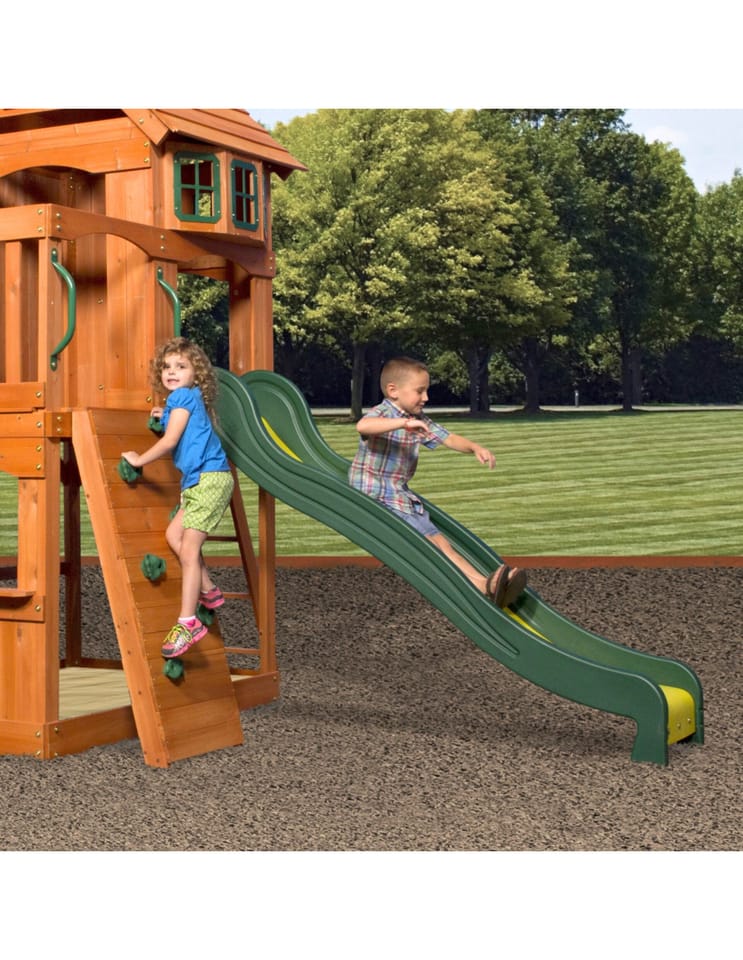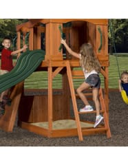 Ogromny Plac zabaw Sunnydale Backyard Discovery to doskonała propozycja do każdego ogrodu. Od teraz zabawa w ogrodzie nie będzie miała końca! Drewniany plac zabaw Atlantic to doskonałe centrum aktywności, które oferuje wiele możliwości zabawy. Znajdziemy tu platformę w formie domku na palach z długą, pofalowaną zjeżdżalnią, na którą dostać się można po drabince lub ścianie wspinaczkowej, która w górnej części posiada uchwyty zapewniające bezpieczeństwo. Całość przykrywa piękny drewniany dach, który zapewni dziecku schronienie przed słońcem. Dodatkowym atutem jest balkonik znajdujący się na górnym poziomie placu zabaw.