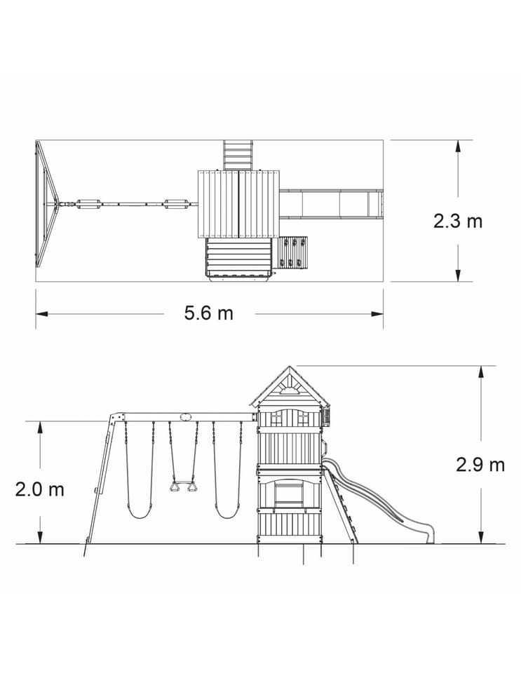 Cechy produktu:Materiał: drewno cedroweWymiary górnej platformy: 163 x 102 cmBalkon na wysokości: 122 cmDługość zjeżdżalni: 244 cmPojemność piaskownicy: ok. 200 Kg piasku
