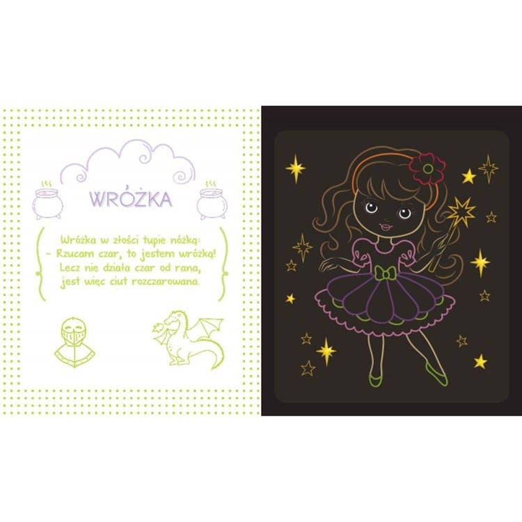 Użyj rysika jak magicznej różdżki, a na pokrytych czernią stronach wyczarujesz kolorowy świat bohaterów bajek. Książeczka z serii „Zdrapywanka z rysikiem" to: • wspaniała zabawa i długie godziny spędzone na rysowaniu, • sposób na doskonalenie koncentracji i dokładności, • pomysł na zajęcie dziecka w czasie podróży. Baw się tą książką i odkrywaj magiczne ilustracje!