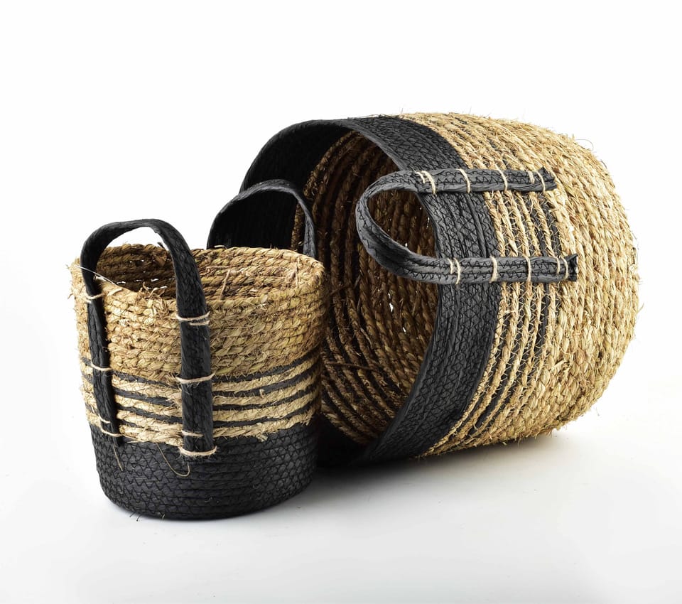 Komplet koszy z serii BALI marki MONDEX. Kosze zostały wykonane z trawy morskiej. Ta forma dekoracji jest hitem ostatnich kilku sezonów z uwagi na swoją niezwykle zróżnicowaną możliwość aranżacji. Dzięki połączeniom kolorystycznym idealnie wpasuje się w każde wnętrze. Kosze z trawy morskiej, który chętnie wykorzystują dekoratorzy w swoich aranżacjach, świetnie sprawdzą się do wnętrz boho, Etno lub eklektycznych. Wymiary: XL:33XH.26H/33H CM Z USZAMI L:24XH.21H/27H 3 CM Z USZAMI