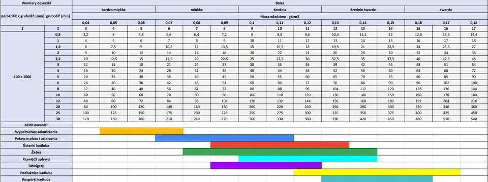 Poniżej tabela przedstawiająca zastosowanie balsy według jej twardości.