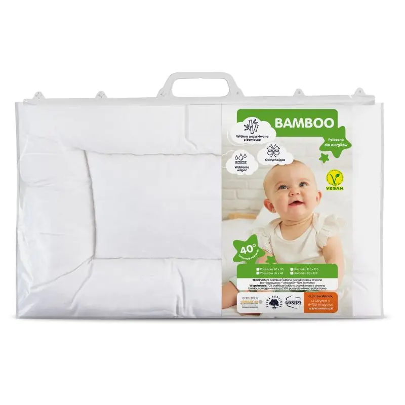 - płaska, bezpieczna poduszka dla najmłodszych - bardzo dobra absorpcja wilgoci, zapewniająca suchy klimat snu – bambus wchłania wilgoć nawet do 3 razy skuteczniej niż bawełna - miękka, bardzo gładka, przyjemna w dotyku tkanina - doskonale oddychająca dzięki porowatej strukturze włókien bambusa - produkt przyjazny naturze – wzrost bambusa odbywa się bez stosowania pestycydów i następuje niezwykle szybko, zapewniając łatwo odnawialny surowiec - produkt wegański - pranie w pralce w temperaturze do 40°C Rozmiar: 40 x 60cm Tkanina 50% bambus (włókno pozyskiwane z drewna bambusowego – wiskoza) - 50% bawełna Wypełnienie 70% bambus (włókno pozyskiwane z drewna bambusowego – wiskoza) – 30% puszyste włókno poliestrowe Opakowanie toreba foliowa z rączką