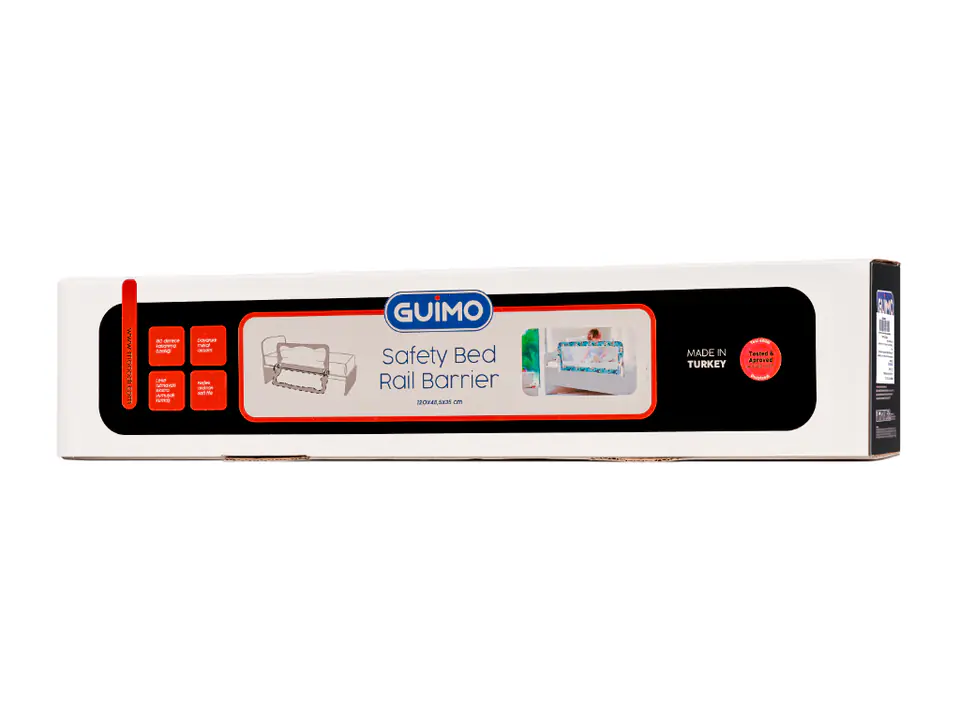 Montaż barierki jest niesamowicie prosty! Należy rozpocząć od jej złożenia, wkładając odpowiednie elementy ramy w otwory materiałowego obszycia siatki. Następnie wystarczy, że uniesiesz materac łóżka i włożysz wystające podstawki barierki pod niego!
