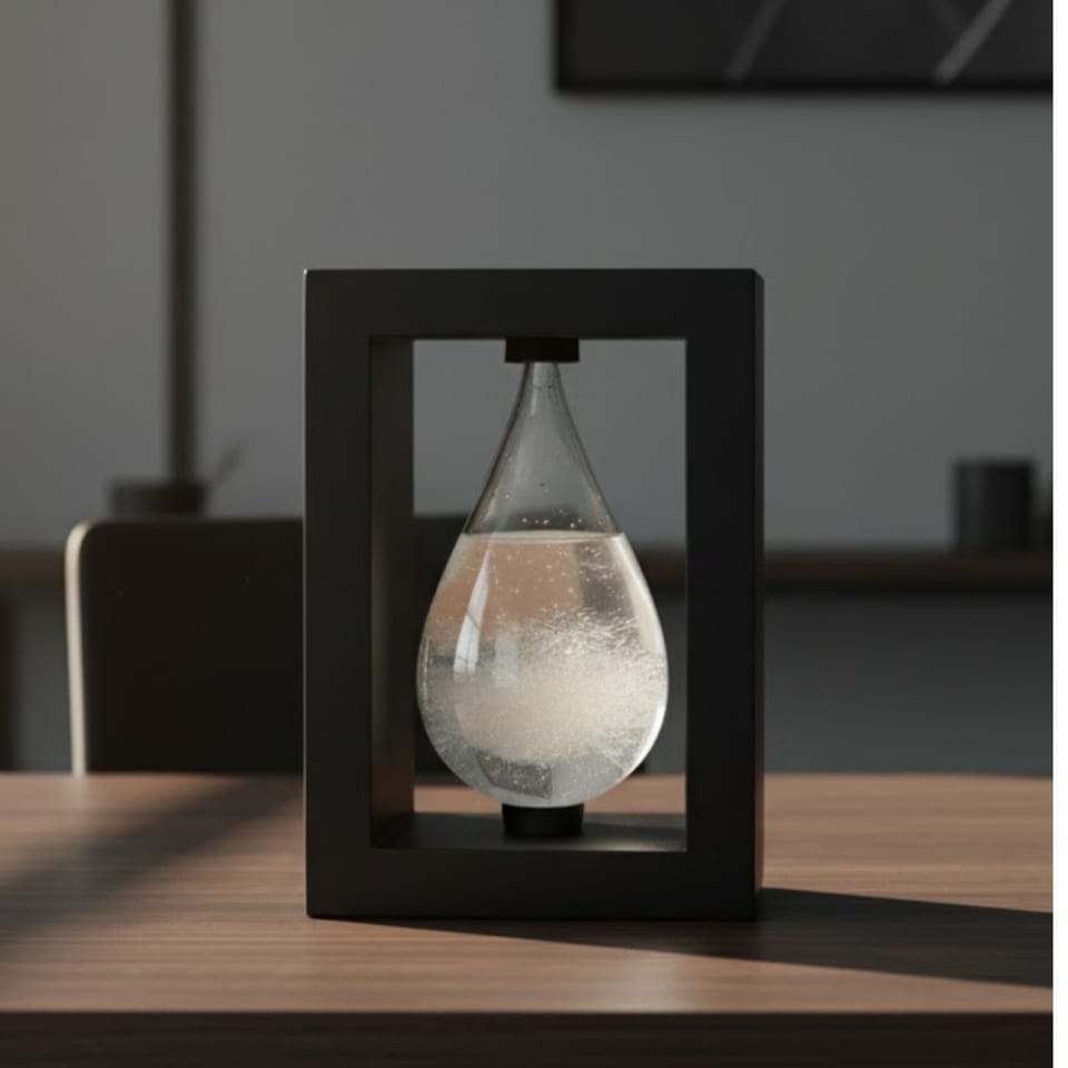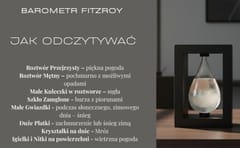 Barometr Burzowy Fitzroya w Oprawie Drewnianej - Kropla Storm Glass – BAW1 BAROMETR CHEMICZNY - KROPLA BURZOWA - STACJA POGODY Unikalny i niezwykłe oryginalny barometr burzowy w kształcie dużej kropli odczytuje jaką będziemy mieć pogodę! Barometr Fitzroya to elegancki i efektowny gadżet, który pozwala w prosty sposób obserwować zmiany pogody. Działa dzięki reakcjom chemicznym w specjalnym roztworze – kiedy ciśnienie powietrza rośnie, płyn się podnosi, a gdy spada, opada. Dzięki temu barometr „przewiduje” pogodę: wskazuje, czy nadchodzą słoneczne dni, deszcz czy burza. To fascynujące połączenie nauki i designu – idealne dla tych, którzy lubią praktyczne, a jednocześnie efektowne akcesoria. UŻYWANY W 50-LATACH XVIII WIEKU Takie niezwykłe barometry były używane już w latach 50-tych XVIII wieku. Karol Darwin używał Barometru Burzowego do przewidywania pogody na swoim statku, między innymi podczas znanej ekspedycji naukowej na Wyspy Galapagos. ZMIENIA KSZTAŁT W ZALEŻNOŚCI OD POGODY W środku znajduje się mieszanka wody destylowanej, etanolu, azotanu potasu, chlorku amonu i kamfory. To właśnie kamfora jest kluczem! W zależności od warunków atmosferycznych – głównie zmian ciśnienia, temperatury i wilgotności – w roztworze tworzą się, rozpuszczają lub zmieniają kształt unikalne kryształy. ·Płyn jest krystalicznie czysty: Prawdopodobnie będzie słoneczna i sucha pogoda. ·W roztworze pojawiają się małe, mętne gwiazdki lub płatki: Oznacza to, że nadchodzi zachmurzenie, mgła lub deszcz. ·Duże, pierzaste kryształy: Sygnalizują zbliżającą się burzę lub intensywny opad deszczu. ·Kryształy tworzą nitki lub nici na górze płynu: Wskazują na wietrzną pogodę. DLACZEGO WARTO ·Elegancka Oprawa: Minimalistyczna, czarna rama z płyty MDF doskonale eksponuje szklaną kroplę, dodając całości nowoczesnego i wyrafinowanego charakteru. ·Wizualna Prognoza Pogody: Obserwacja zmian formy kryształów (mętny, klarowny, pierzasty) jest intuicyjnym i fascynującym sposobem na przewidywanie zmian pogody. ·Element Dekoracyjny: Solidna ramka i estetyczny kształt sprawiają, że barometr ten idealnie pasuje do gabinetu, biura czy salonu, podnosząc ich prestiż. ·Trwała Konstrukcja: Szkło jest bezpiecznie osadzone w ramie MDF, co chroni delikatne naczynie i zapewnia stabilność na biurku lub półce. ·Oryginalny Gadżet: Jest to replika przyrządu, który służył do przewidywania sztormów, co czyni go ciekawym i merytorycznym dodatkiem dla miłośników historii i nauki. Informacje o produkcie: ·Produkt: Storm Glass (Barometr Fitzroya) ·Kształt: Kropla ·Materiał naczynia: Szkło ·Materiał ramy/podstawy: Płyta MDF (w kolorze czarnym) ·Wysokość: 14 cm ·Szerokość: 10 cm ·Głębokość: 5 cm ·Skład płynu: Woda, etanol, kamfora naturalna oraz inne składniki (np. chlorek amonu, azotan potasu) ·Zasada działania: Zmiana wyglądu kryształów w zależności od temperatury otoczenia i ciśnienia atmosferycznego. ·Zastosowanie: Prognozowanie pogody, dekoracja stołu/półki DOSKONAŁY UPOMINEK DLA: ·Dla Meteorologa Amatora: Fantastyczny, wizualny przyrząd do obserwacji pogody, uzupełniający tradycyjne termometry i barometry. ·Dla Ozdoby Biurka/Biura: Minimalistyczna, szklana dekoracja, która dodaje elegancji i jest tematem do rozmów. ·Dla Nauczyciela/Naukowca: Idealny, intrygujący prezent o naukowym rodowodzie, objaśniający zjawiska krystalizacji. ·Dla Osób Ceniących Spokój: Obserwacja powolnych zmian wewnątrz naczynia działa relaksująco i odprężająco. ·Dla Miłośnika Żeglarstwa/Podróżnika: Historycznie związany z morskimi wyprawami, jest symbolem przygody i tradycyjnej nawigacji. NIE TYLKO WSKAŹNIK, ALE TAKŻE DEKORACJA Barometr Fitzroya to idealny przedmiot dla każdego. Jest to wyjątkowy, hipnotyzujący gadżet, który łączy w sobie historyczną ciekawość z elementem dekoracyjnym. To efektowna ozdoba i intrygujący temat do rozmów w każdym salonie, gabinecie czy biurze. JAK DZIAŁA BAROMETR FITZROYA: Barometr Fitzroya, znany też jako Storm Glass lub Kryształ Burzowy, to historyczny instrument meteorologiczny, spopularyzowany przez wiceadmirała Roberta FitzRoya, kapitana HMS Beagle (okrętu, na którym Charles Darwin odbył słynną podróż). FitzRoy wykorzystywał i doskonalił ten przyrząd do przewidywania pogody na morzu, publikując szczegółowe instrukcje jego użycia. Kluczowym składnikiem barometru jest kamfora, organiczny związek terpenowy, oraz towarzyszące jej sole: azotan potasu i chlorek amonu, rozpuszczone w mieszance etanolu i wody destylowanej. Roztwór jest szczelnie zamknięty, ale nie działa jak typowy barometr mierzący ciśnienie atmosferyczne. Fizykochemiczne Zjawisko Krystalizacji Działanie barometru opiera się na zjawisku krystalizacji i rozpuszczania kamfory w cieczy. Jest to proces silnie zależny od subtelnych zmian termodynamicznych otoczenia, które często poprzedzają faktyczną zmianę pogody. 1.Temperatura i ciśnienie: Zmiany temperatury i ciśnienia atmosferycznego wpływają na rozpuszczalność kamfory w roztworze. 2.Kondensacja: Uważa się, że wpływ ma również kondensacja wilgoci na powierzchni kryształów wewnątrz naczynia, co jest bardziej wyraźne, gdy wilgotność zewnętrzna wzrasta. 3.Tworzenie kryształów: Obniżenie temperatury (często związane z nadejściem frontu chłodnego lub burzy) oraz zmiany ciśnienia prowadzą do szybszego wytrącania się i wzrostu kryształów kamfory w roztworze.