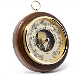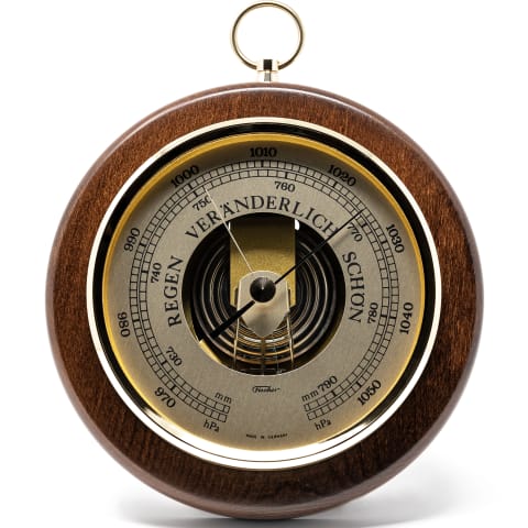 Wysokiej klasy barometr okrągły 1436R. Marka: Fischer, Niemcy. Klasyczny barometr z widocznym mechanizmem. Urządzenie osadzone w mosiężnej oprawie. Drewniana podstawa. Nazwy w języku angielskim. Średnica: 17cm Średnica tarczy instrumentu : 13,5cm Materiał: mosiądz, stal nierdzewna, drewno Dokładność pomiaru barometru: ± 2 hPa Powszechnie wiadomo, że im wyżej nad poziomem morza, tym niższe ciśnienie. Im wyższe ciśnienie, tym coraz mniej zmienna pogoda. Przy ciśnieniu wyższym, niż 1020 mbar możemy oczekiwać suchego, pogodnego dnia. Latem będzie to po prostu ładna pogoda, zimą dzień zapewne mroźny (choć z możliwością wystąpienia mgieł). Ciśnienie w przedziale 1005 – 1020 mbar to pogoda zmienna. Momenty rozjaśnień przeplatać się mogą z przelotnym deszczem. Przy ciśnieniu poniżej 1000 mbar niebo będzie zasnute chmurami i możemy oczekiwać deszczu. Wzrost ciśnienia oznacza poprawę, i odwrotnie, jego spadek to pogorszenie pogody. Letnie, nagłe, wyraźne skoki ciśnienia mogą oznaczać silne burze. Barometr to bardzo precyzyjne urządzenie mierzące ciśnienie powietrza. Wykorzystuje w tym celu tzw. puszkę próżniową, której ścianki rozszerzają się lub zwężają o setne milimetra w zależności od zmieniającego się ciśnienia powietrza. Skalowanie barometru przeprowadzone zostało w fabryce. Jednak na skutek np. silnych wstrząsów nowa regulacja może okazać się konieczna. Aby ją przeprowadzić należy użyć śrubokrętu i wyregulować śrubę na tylnej ściance urządzenia zgodnie z zaleceniami załączonej instrukcji.