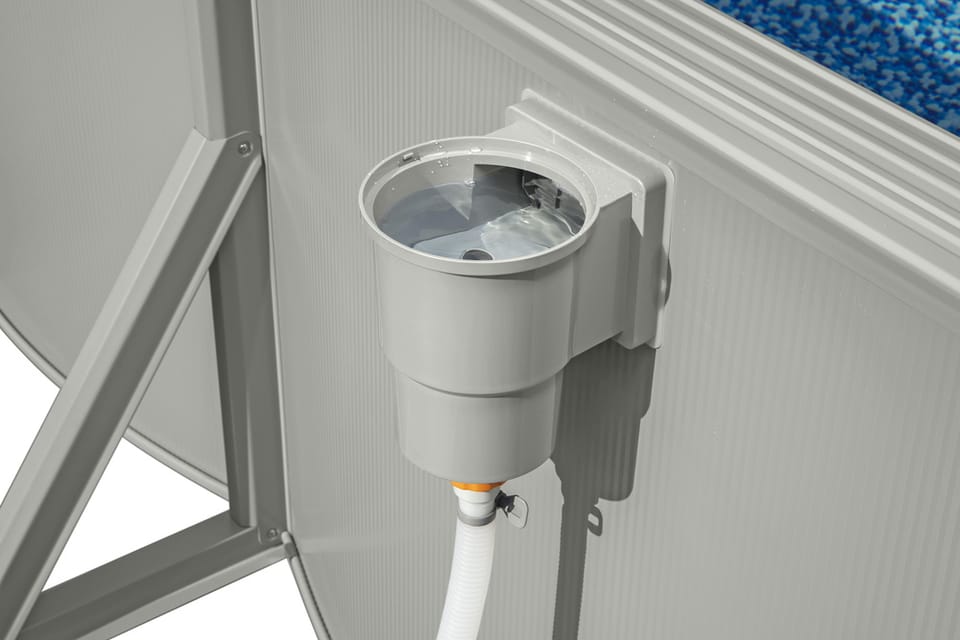 Zbudowany z ocynkowanej stali odpornej na korozję, zapewnia wielosezonowe użytkowanie. Ściany, górna krawędź oraz rama są w całości wykonane ze stali, a pokryte warstwą cynku, co chroni je przed rdzewieniem i uszkodzeniami wywołanymi przez czynniki atmosferyczne. Unikalna konstrukcja stalowego grzbietu wzdłuż ścian basenu zapewnia dodatkowe wsparcie, utrzymując basen w idealnym stanie przez długi czas. Wnętrze basenu ozdobione jest atrakcyjną powłoką Prismatic Stone™, odporną na promieniowanie UV, co zapobiega blaknięciu i pękaniu materiału pod wpływem słońca. Dzięki trwałym materiałom konstrukcyjnym, basen pozostaje na Twoim podwórku przez cały rok i nie wymaga demontażu na zimę.