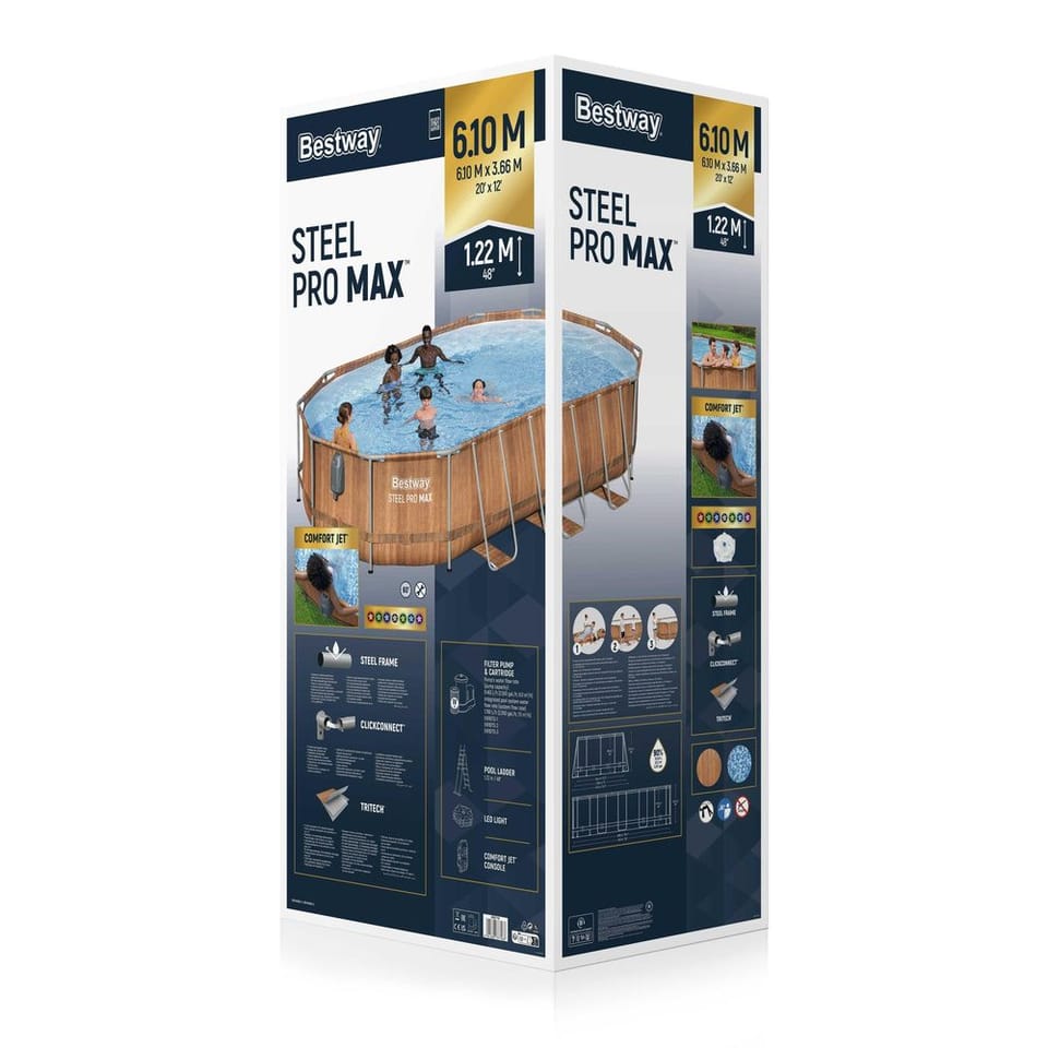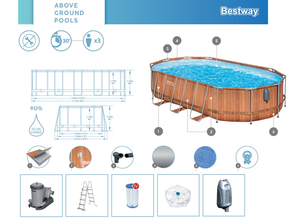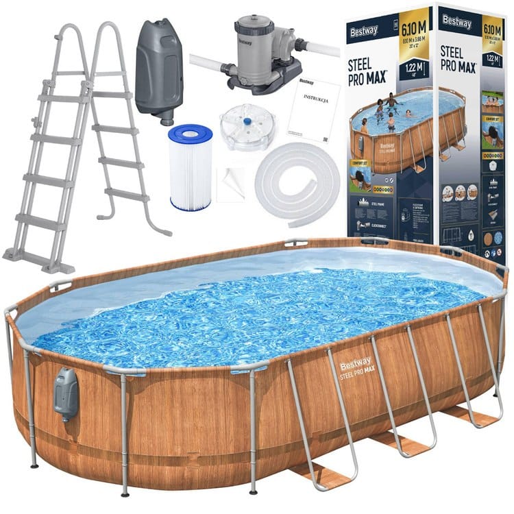 Wymiary basen: długość 610 cm, szerokość 366 cm, wysokość 122 cm