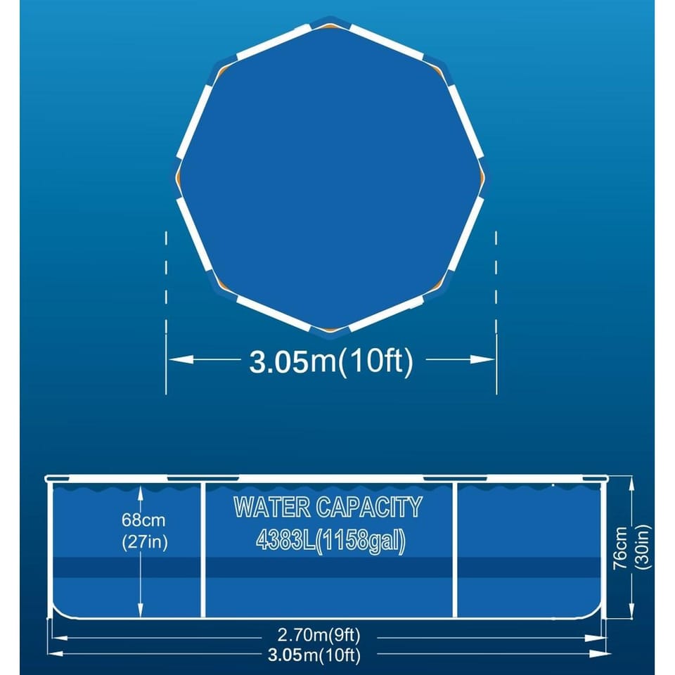 - Wymiary po napompowaniu ok.: 300 x 76 cm (śr. x wys.)Pojemność: 4383L przy napełnieniu do 80% wodyMateriał: PVCKolor: NiebieskiZestaw naprawczy: TakPompa filtrująca: NieAdapter do podłączenia pompy filtrującej i korek spustowyMata zabezpieczająca: NieOdpowiedni dla dzieci powyżej 6 latMarka: Avenli