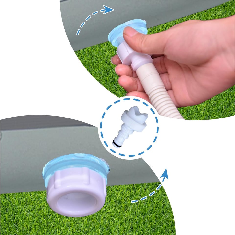 Basen wyposażony jest w przyłącza o średnicy 32 mm, które umożliwiają podłączenie standardowych pomp filtrujących oraz systemów filtrów piaskowych. To zapewnia stałą cyrkulację wody i jej doskonałą czystość przez cały czas użytkowania.