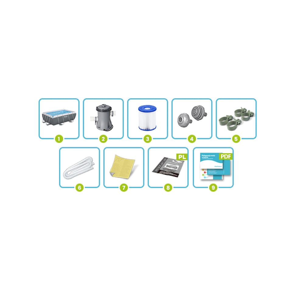 | - basen 56629,- pompa filtrująca 58381,- filtr 58093- kolorowe opakowanie. |