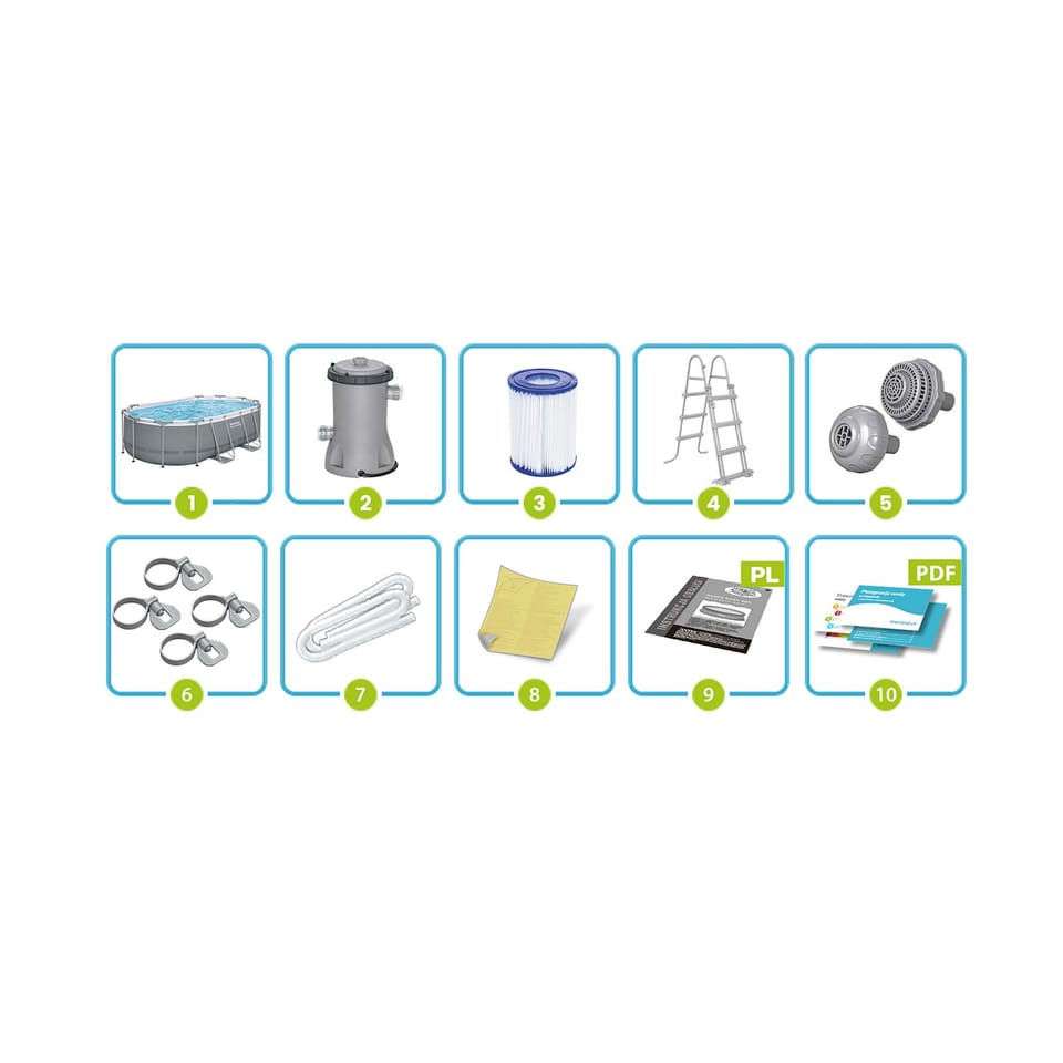 - basen 56620, - pompa filtrująca 58383, - filtr do pompy 58094, - drabinka 58330, - zestaw naprawczy, - instrukcja, - kolorowe pudełko.
