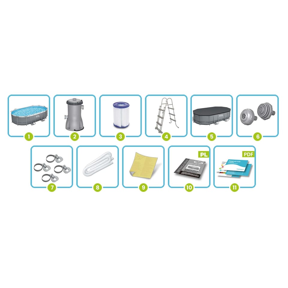| - basen 56448, - pompa filtrująca 58386, - filtr 58094,- pokrywa,- drabinka 58330,- zestaw naprawczy, - instrukcja, - kolorowe pudełko. |