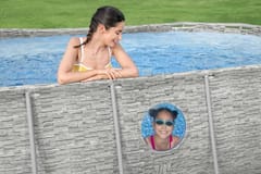 - odporny na korozje stelaż z owalnymi rurkami, - 2 przezroczyste okienka wykonane w technologii SWIM VISTA, - wyjątkowa wytrzymałość ścian bocznych basenu uzyskiwana jest dzięki zastosowaniu technologii Tritech ™. Trójwarstwowy materiał wzmocniony rdzeniem z siatki poliestrowej umieszczonej między dwiema warstwami odpornego materiału PVC tworzy całkowitą grubość 0.40-0.80mm (16-32 gauge) w zależności od wielkości basenu, zapewniając doskonałą wytrzymałość i trwałość. - wbudowany zawór spustowy, - basen wyposażony w CLICKCONNECT™ zabezpieczający połączenie między elementami stelażu, - wbudowany zawór spustowy w połączeniu z dołączonym adapterem pozwala na łatwe odprowadzanie wody przy użyciu węża ogrodowego, - ścianki wewnętrzne basenu pokryte mozaikową grafiką, - zewnętrzne ścian pokryte szarą rattanową grafiką w technologii FROST FINISH, - złącza kontrolujące przepływ, - łatwy montaż,