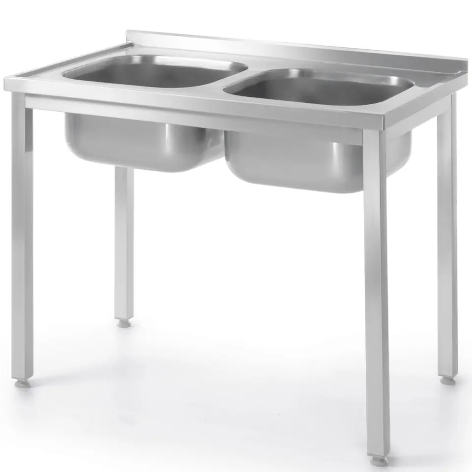 Kod producenta: 817049Zlewozmywak marki Hendi sprawdzi się w restauracjach, barach, hotelach, szpitalach czy laboratoriach. Jego wytrzymała konstrukcja wykonana została ze stali nierdzewnej AISI 430. Przedmiot posiada dwukomorowy zlew, otwory na syfon i baterię. Komora zlewu tłoczona została z jednego arkusza stali i wspawana bezszczelinowo w blat. Standardowy otwór w dnie syfonu ma średnicę 50 mm, a miejsce na zamontowanie baterii - 30 mm. Rant zabezpieczający ścianę przed zabrudzeniem ma 40 mm. Nogi wykonane zostały z profili 40 x 40 mm. Skręcana konstrukcja mebla umożliwia jego złożenie, magazynowanie oraz przewożenie. Stopki są regulowane w zakresie +25/-5 mm. Dopuszczalne obciążenie blatu wynosi ok. 70 kg/m2.Cechy produktu:
