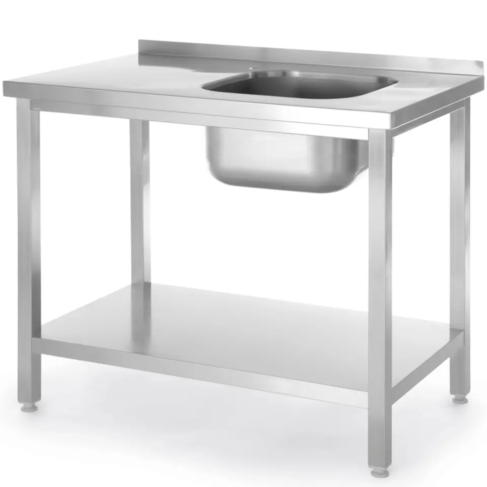 Kod producenta: 816998Stół ze zlewem marki Hendi sprawdzi się w restauracjach, barach, hotelach, szpitalach czy laboratoriach. Zlew umieszczony jest po PRAWEJ stronie stołu Jego wytrzymała konstrukcja wykonana została ze stali nierdzewnej AISI 430. Przedmiot posiada zlew, półkę, otwory na syfon i baterię. Zlew tłoczony został z jednego arkusza stali i wspawany bezszczelinowo w blat. Komora zlewu ma wymiary 400 x 400 x (H) 250 mm. Standardowy otwór w dnie do syfonu wynosi 50 mm, miejsce na zamocowanie baterii 30 mm. Rant zabezpieczający ścianę przed zabrudzeniem ma szer. 40 mm. Półka nie ma możliwości regulacji - wysokość od podłogi do jej dolnej krawędzi wynosi 160 mm. Nogi wykonane zostały z profili 40 x 40 mm. Skręcana konstrukcja mebla umożliwia łatwe jego złożenie, magazynowanie i przewożenie. Stopki są regulowane +25/-5 mm. Dopuszczalne obciążenie blatu wynosi ok. 70 kg/m2.Cechy produktu: