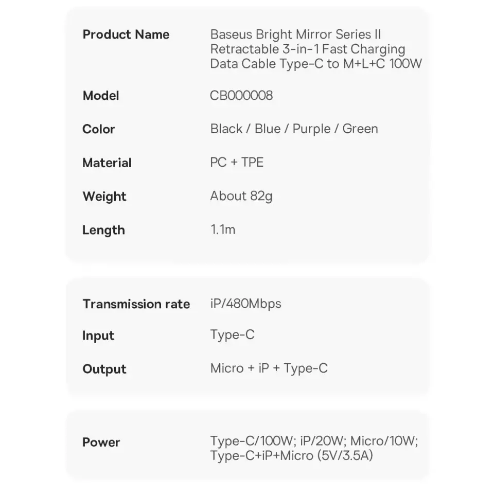 Baseus Bright Mirror 2 zwijany kabel przewód 3w1 USB Typ C - micro USB + Lightning + USB Typ C 3.5A 1.1m czarny CAMJ010201
