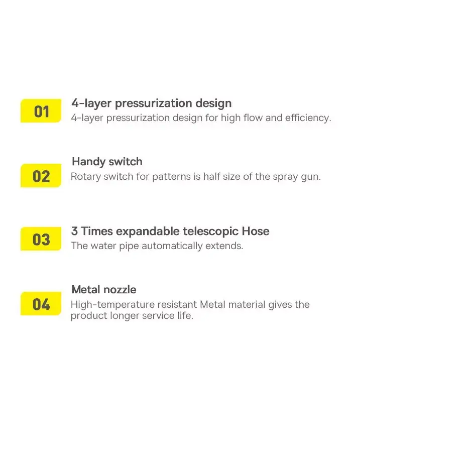 - Zapewnia dużą siłę natrysku. Pistolet zraszający ma wbudowane cztery elementy, które zwiększają ciśnienie wody