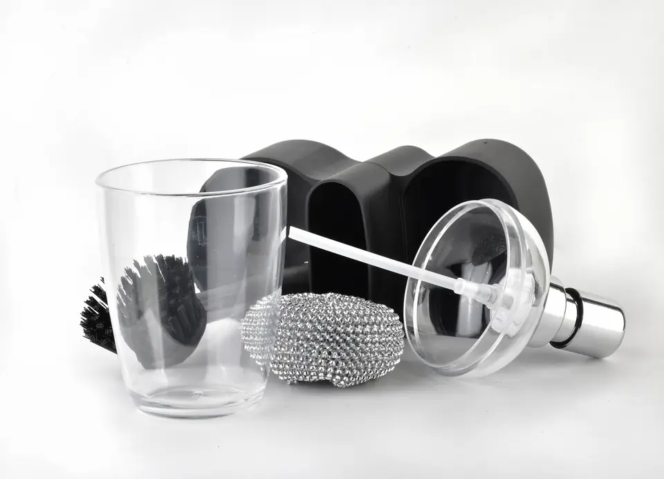 Dozownik kuchenny ze szczotką oraz druciakiem. Podstawa jest wykonana z szarego silikonu wysokiej jakości. Dozownik jest wykonanay z tworzywa TPR.wymiar całego zestawu: 16x9xh18cmwymiar dozownika:8x8h18cmszczotka: 18cmśrednica główki szczotki: 4,5cmśrednica druciaka:7,5x3cmpoj.480mlzapakowany w biały karton: 17,5z9xh19cmwaga: 440g