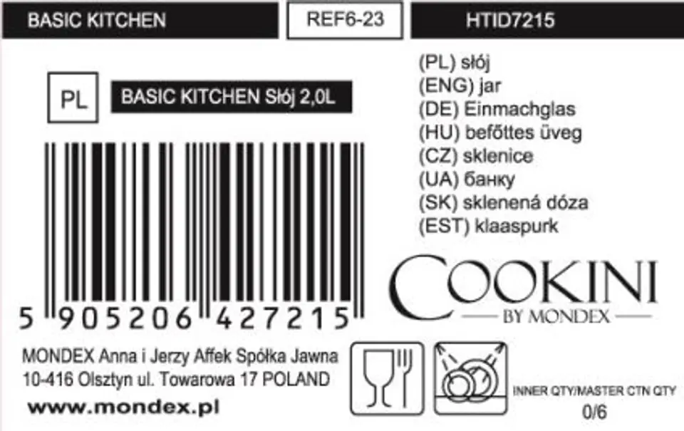 Słój szklany BASIC KITCHEN: niezbędny dodatek do Twojej kuchni!Jeśli szukasz wytrzymałego, stylowego i funkcjonalnego słoja na przechowywanie, to szklany słój BASIC KITCHEN jest idealnym rozwiązaniem. Jego trwała, plastikowa pokrywka doskonale nadaje się do przechowywania twoich ulubionych produktów spożywczych i przygotowanych potraw. Wystarczy włożyć je do słoja, zamknąć pokrywkę i gotowe!pojemność:2,0L wymiar:14xh21,5cm /h25cm z rączką średnica otworu: 8,5cmśrednica spodu: 10cmwaga: 880gbez opakowania jednostkowego, 6 szt w kartonie zbiorczym