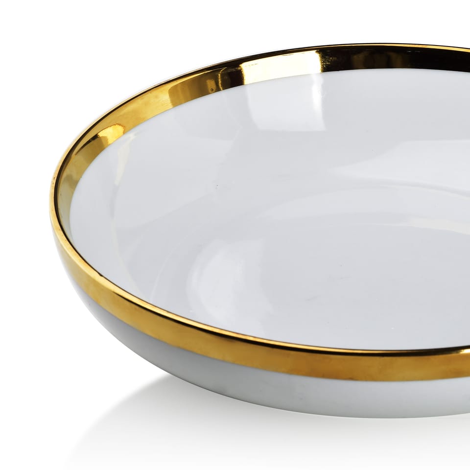 Porcelanowa misa z serii BASIC. Biała patera ze złotą obwódką. Misa została wykonana z drugiego gatunku porcelany. Biała misaozdobiona jest złotym rantem na górnej krawędzi produktu. Idealne wyposażenie jadalni oraz jako dekoracja do salonu. Spełni funkcję naczynia na ciasto oraz słodkie czy słone przekąski. Wyposażenie jadalni w paterę porcelanową to duże ułatwienie podczas rodzinnych imprez i spotkań z przyjaciółmi.Patera doskonale wpasuje się w nowoczesne wnętrza, gdzie cenione są połączenia złota z klasycznymi kolorami. Ze względu na złote wykończenia, Patery NIE NALEŻY MYC W ZMYWARCE orazużywać w piekarniku czy kuchence mikrofalowej. Nie posiada opakowania jednostkowego.II GATUNEKwymiary:24.8xh5.5cm