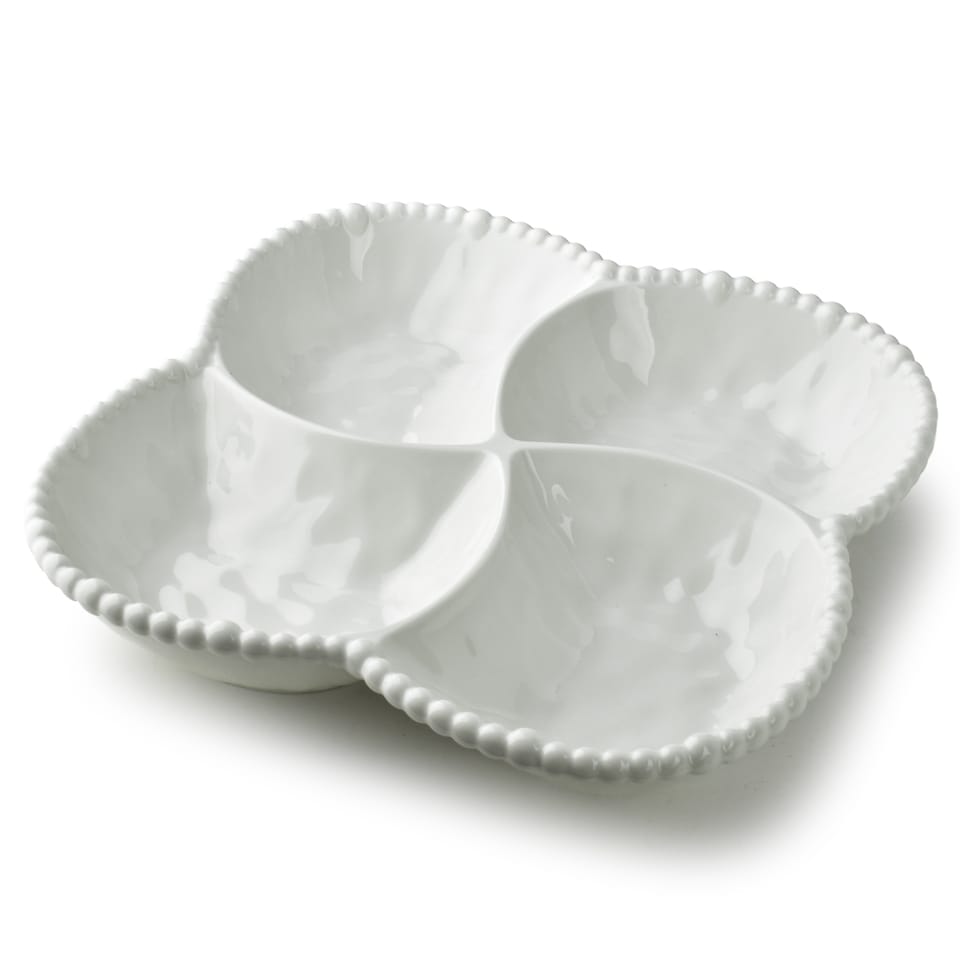 Białe, porcelanowe naczynie czterodzielne prezentuje się elegancko i subtelnie dzięki delikatnym kuleczkom biegnącym dookoła jego krawędzi. Ma klasyczny, lekko zaokrąglony kształt, a cztery symetryczne przegródki pozwalają wygodnie serwować różne przekąski, dodatki lub sosy w jednym naczyniu, zachowując porządek i estetykę podania. Gładka, błyszcząca powierzchnia porcelany podkreśla jego wysoką jakość i sprawia, że świetnie komponuje się zarówno z minimalistyczną zastawą, jak i bardziej dekoracyjnymi elementami stołu. To naczynie łączy praktyczność z eleganckim, ponadczasowym stylem, idealnie nadając się do codziennych posiłków i uroczystych przyjęć.II gatuenkwaga: 1,05kgwymiar: 25x25x5cm