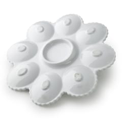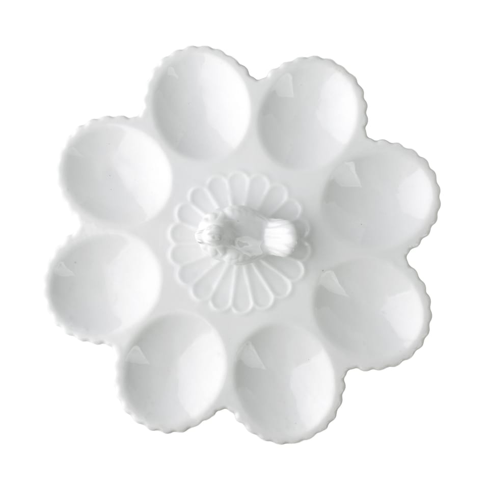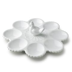 BASIC talerz na 8 jajek o wymiarach 23 23 7,5 cm to dekoracyjne, porcelanowe naczynie w II gatunku, zaprojektowane w formie kury, co nadaje mu wyjątkowy, rustykalny i jednocześnie zabawny charakter. Osiem specjalnie wyprofilowanych zagłębień pozwala stabilnie ułożyć jajka . zarówno gotowane, jak i faszerowane . dzięki czemu talerz doskonale sprawdza się podczas świąt, rodzinnych śniadań czy przyjęć.Porcelana w II gatunku może posiadać lekkie, wizualne niedoskonałości, które nie wpływają na funkcjonalność naczynia. Talerz prezentuje się estetycznie i przyciąga wzrok dzięki swojej oryginalnej formie, łącząc praktyczność z dekoracyjnym charakterem. To efektowny element zastawy, idealny szczególnie na wielkanocny stół.