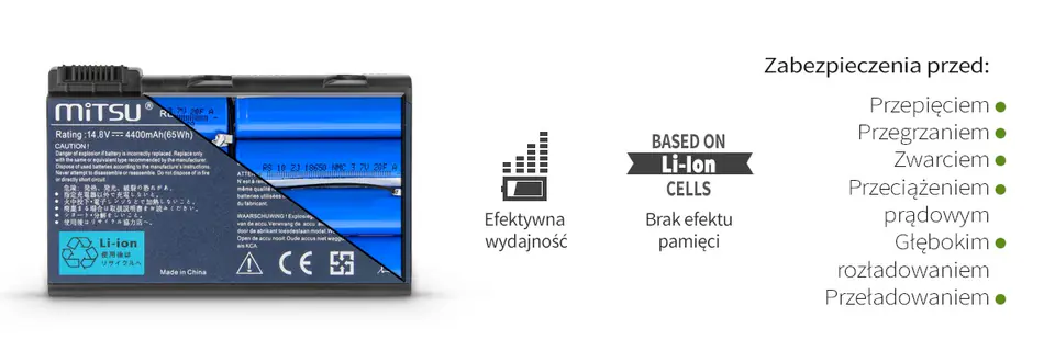 Akumulatory MITSU to sprawdzone i docenione już przez dziesiątki tysięcy klientów dedykowane baterie do notebooków i laptopów oraz ultrabooków i netbooków, znane przede wszystkim na rynku polskim i czeskim. Każda bateria sygnowana logiem MITSU to wyjątkowa dbałość o bezpieczeństwo. Fabrycznie nowe zabezpieczenia przed przepięciem, przegrzaniem, zwarciem, przeciążeniem prądowym, głębokim rozładowaniem i przeładowaniem to dla Ciebie spokój ducha, a dla MITSU obowiązek i obietnica nienaruszalnych standardów jakości.
