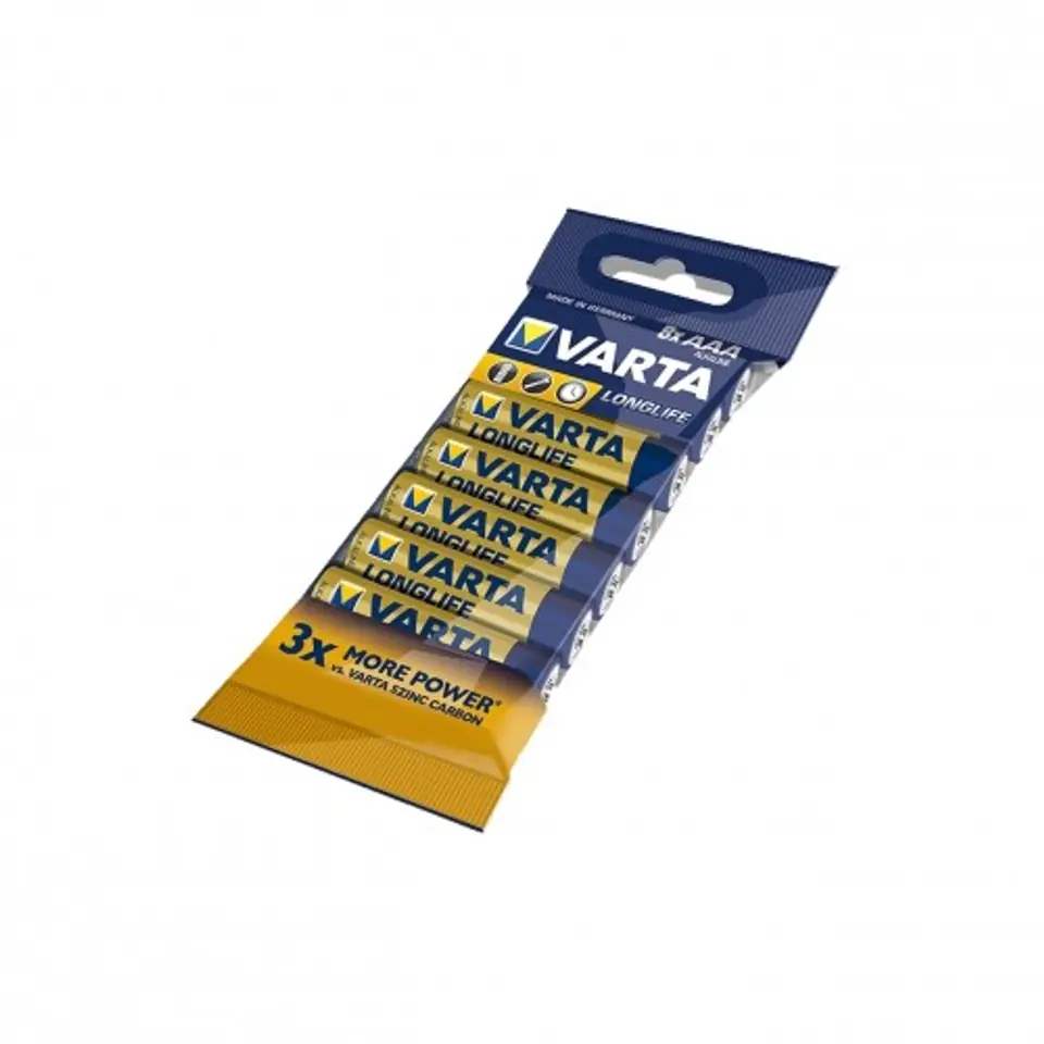 Baterie alkaliczne Varta Longlife o rozmiarze AAA i napięciu 1.5 V. Przeznaczone do zasilania sprzętów codziennego użytku takich jak budziki, piloty i latarki. W opakowaniu znajduje się osiem sztuk.