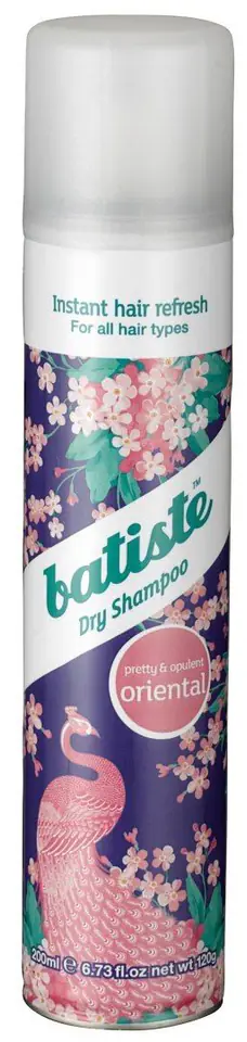 Batiste to seria suchych szamponów dopasowanych do wszystkich stylów,typów i kolorów włosów.To znakomity sposób na bajecznie piękne i świeże włosy w przypadku gdy nie ma czasu lub warunków na ich umycie.Włosy są błyskawicznie odświeżone,zyskują na objętości,stają się miękkie i pachnące.Wyjątkowa formuła oparta na skrobii ryżowej nie wymaga wyczesywania-wystarczy spryskać i wmasować.