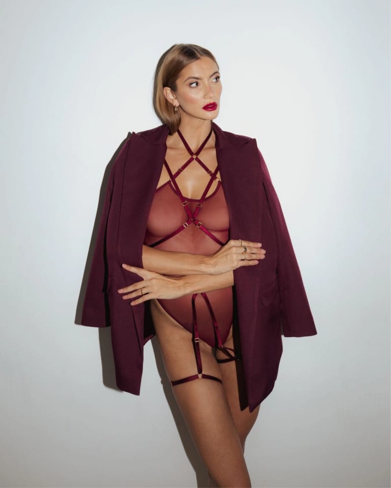 Głęboki burgundowy odcień podkreśla sensualność i tajemniczy charakter bielizny, sprawiając, że body harness idealnie komponuje się zarówno z erotycznymi stylizacjami, jak i jako ekstrawagancki dodatek noszony na odzież. Świetnie współgra z Body Batty z tej samej kolekcji, tworząc pełen namiętności komplet, który rozpala wyobraźnię i uwodzi każdym detalem.