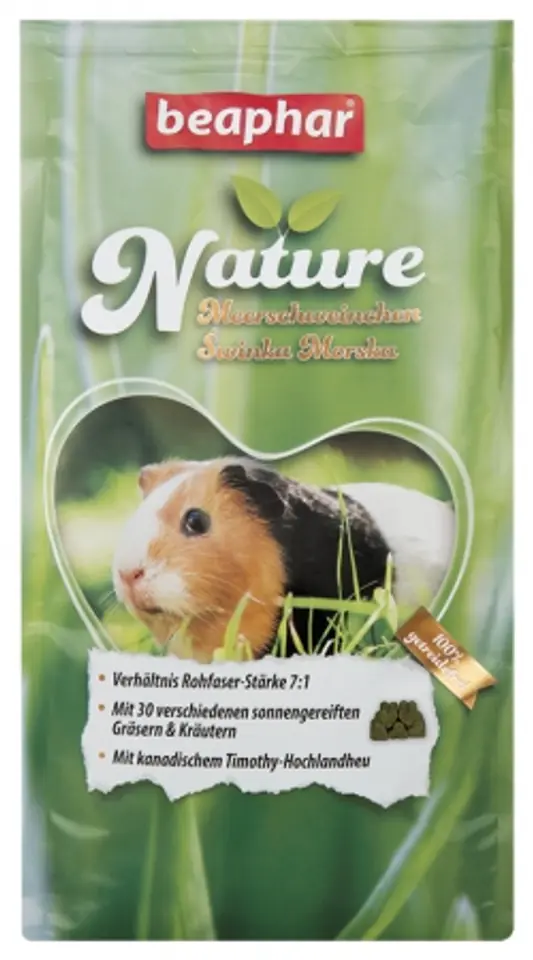 Nature Świnka Morska to zdrowa i smaczna karma klasy Super Premium dla świnek morskich. Karma nie zawiera zbóż i wyróżnia się wysoką zawartością włókna pokarmowego. Taki skład zapewnia właściwe funkcjonowanie jelit. Zróżnicowanie składników osiągnięto przez wykorzystanie 30 różnych gatunków traw i ziół. Nature Świnka Morska wyróżnia się wysoką zawartością witaminy C, która jest świnkom szczególnie potrzebna, gdyż same nie są w stanie jej syntetyzować.