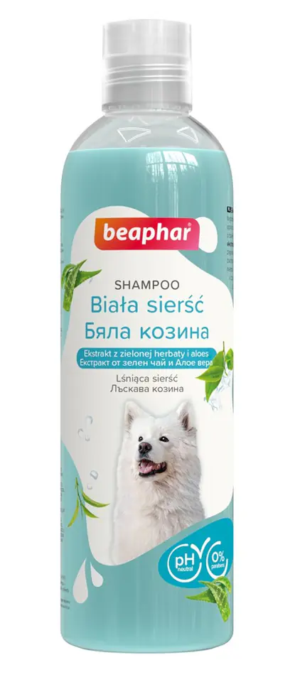 Beaphar Szampon Biała Sierść to łagodny szampon o neutralnym pH, opracowany specjalnie dla wszystkich psów o białej i jasnej sierści. Szampon wzbogacony ekstraktem z zielonej herbaty i aloesem zapewnia miękką i błyszczącą sierść oraz zachowuje jej naturalny biały kolor. Dzięki niemu Twój pies będzie pachniał świeżością i czystością. Nie zawiera parabenów.
