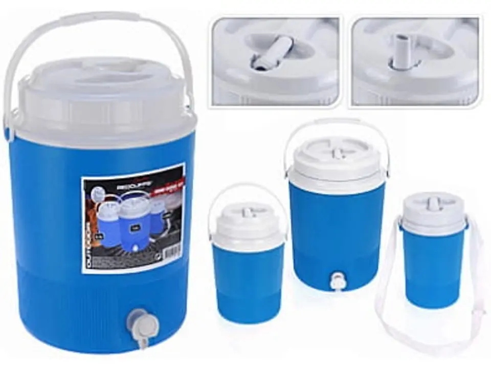 Beczki pojemniki zbiorniki na wodę zestaw 3 szt. niebieskie Beczki na wodę idealnie sprawdzą się w podróży w ciepłe dni.Zestaw zawiera 3 szt beczek gdzie zabierzesz ze sobą wszędzie. Beczki posiadają uchwyt,wykonany z tkaniny do zawieszenia, a także mają małą wylewkę w pokrywie do serwowania napojów.Duża beczka z dozownika napojów, ma mały kran 7,5 l, średnia beczka: 2,4 l, mała beczka typ butelki na wodę: 1,25lDane techniczne: Wymiary:Duża beczka:wysokości ok.33 cm x średnicy 22 cmŚrednia beczka: wysokość ok. 25 cm x średnica 15 cm,Mała beczka: wysokość ok. 20 cm x średnica 11 cm, Kolor: niebieski