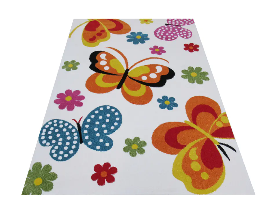 Pięknie kolorowe motylki oraz urocze kwiatuszki, które zostały umieszczone na dywanie z kolekcji Mondo doskonale odnajdą się w pokoju małej dziewczynki. Eleganckie kremowe tło doskonale podkreśla kolorystykę motyli. Powstał z najwyższej jakości materiałów, które są odporne na zabrudzenia oraz odbarwienia, a dodatkowo są całkowicie bezpieczne dla kontaktów z dziećmi i niemowlętami.