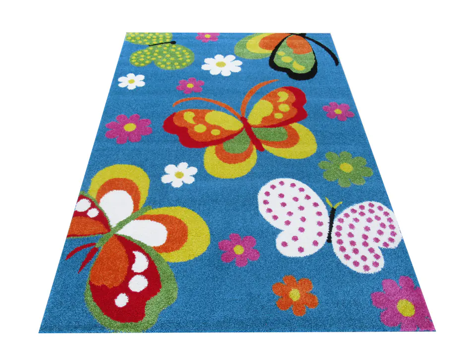 Pięknie kolorowe motylki oraz urocze kwiatuszki, które zostały umieszczone na dywanie z kolekcji Mondo doskonale odnajdą się w pokoju małej dziewczynki. Intensywne niebieskie tło doskonale podkreśla kolorystykę motyli. Powstał z najwyższej jakości materiałów, które są odporne na zabrudzenia oraz odbarwienia, a dodatkowo są całkowicie bezpieczne dla kontaktów z dziećmi i niemowlętami.