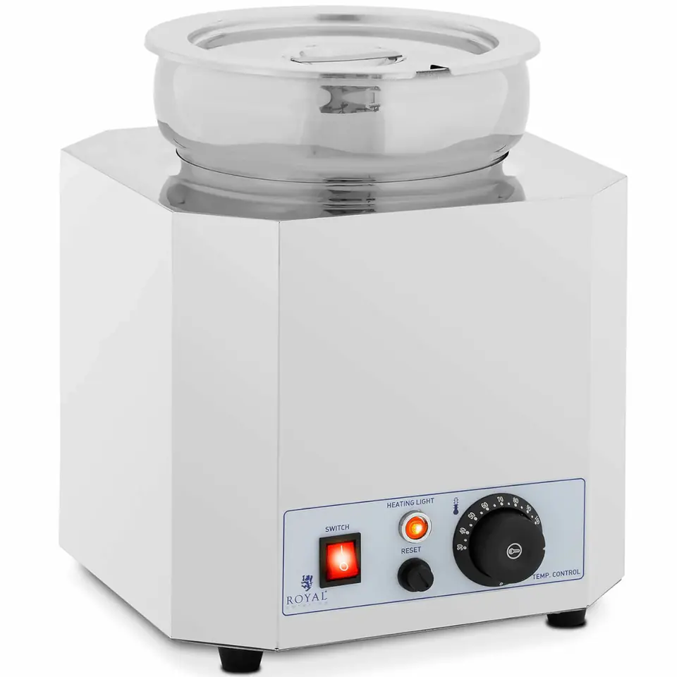 Stacja do zupy marki Royal Catering sprawdzi się w restauracji, jadłodajni czy małej gastronomii do utrzymywania w cieple zup, gulaszów, sosów, czekolady czy kremowego serowego fondue. Stacja wyposażona została w okrągły garnek o pojemności 7 l i dopasowaną pokrywkę. Temperatura regulowana jest w zakresie 30-110°C za pomocą pokrętła. Moc podgrzewacza wynosi 500 W. Bemar działa jako system zamknięty i nie musi być napełniany wodą. Podgrzewacz wykonano ze stali nierdzewnej, jest trwały, wytrzymały i łatwy w czyszczeniu.