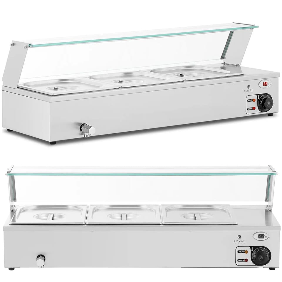 Kod producenta: 10012621Bemar marki Royal Catering pozwala przechować w 3 pojemnikach gastronomicznych składniki potrawy lub kilka gotowych dań. Sprzęt nadaje się do mięsa, ryb, warzyw, ryżu, ziemniaków, sosów itd. Bemar grzewczy optymalnie zaspokoi potrzeby lokali gastronomicznych nawet wysokiej klasy. Nadaje się do użytku w restauracjach, hotelach, pensjonatach, stołówkach, bufetach, barach z przekąskami, kawiarniach lub domach seniorów i klinikach. Bemar działa na zasadzie konwekcji. Element grzewczy podgrzewa wodę znajdującą się między urządzeniem a pojemnikami GN i przekazuje ciepło do pojemników. Oznacza to, że nawet delikatne dania są podgrzewane i utrzymane w cieple przez długi czas, bez ryzyka przypalenia. Bemar mieści 3 pojemniki GN 1/2 z pokrywkami. Ponadto w bemarze elektrycznym można zastosować inne rozmiary pojemników GN i połączyć je ze sobą. Duża moc 2000 W pozwala szybko podgrzać wodę do żądanej temperatury. Automatyczny termostat włączany jest za pomocą pokrętła, które reguluje temperaturę w zakresie 30-110deg;C. Osłona ze szkła hartowanego chroni żywność przed zabrudzeniem. Pomaga utrzymać jej temperaturę, a jednocześnie umożliwia świetną prezentację. Kranik spustowy ułatwia napełnianie, opróżnianie i czyszczenie sprzętu. Bemar posiada przemyślaną konstrukcję i solidną obudowę. Stal nierdzewna sprawia, że jest bardzo wytrzymały, odporny na korozję, bezpieczny dla zdrowia oraz łatwy w czyszczeniu. Stal nierdzewna ma również doskonałą odporność na zużycie oraz uderzenia. Gumowe nóżki zapewniają stabilne ustawienie i zapobiegają zarysowaniom podłoża.Cechy produktu: