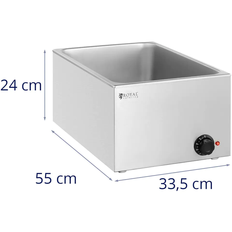 Kod producenta: 10012827Bemar marki Royal Catering pozwala przechowywać potrawy w idealnej temperaturze przez długi czas. Przeznaczony został do pojemników GN 1/1 (brak w zestawie) lub do kombinacji mniejszych rozmiarów. Znajdzie zastosowanie w restauracjach, hotelach, stołówkach, bufetach, barach szybkiej obsługi, domach spokojnej starości czy w klinikach. Duża pojemność 17 l pozwala zmieścić dużą ilość potrawy. Temperatura regulowana jest za pomocą pokrętła w zakresie 30-80deg;C. Element grzewczy o mocy 640 W podgrzewa wodę do wskazanej temperatury. Dzięki kąpieli wodnej potrawy nie przypalają się. Urządzenie wykonane zostało z wysokiej jakości stali nierdzewnej, jest odporne na korozję, łatwe w czyszczeniu i nieszkodliwe dla zdrowia. Gumowe nóżki zapewniają bemarowi stabilność.Cechy produktu: