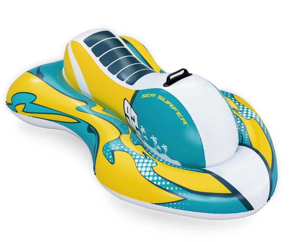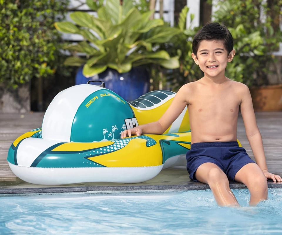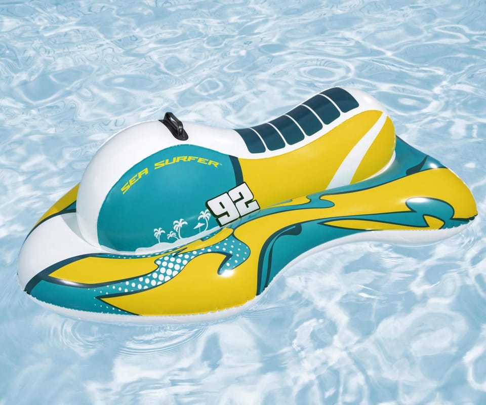 Skuter Wodny do Pływania dla Dzieci Bestway® Sea Surfer™Vroom vroom! Dzieci mogą poczuć dreszczyk emocji na otwartej wodzie podczas jazdy dmuchanym skuterem wodnym Bestway® Sea Surfert! Skuter ma wbudowany jeden solidny uchwyt, dzięki czemu dzieci mogą się go łatwo chwycić, podczas śmigania po falach na plaży, jeziorze lub basenie. Warstwa ochronna Color Shield™ utrzymuje jasne kolory i zapobiega ich przenoszeniu na skórę, gdy jest mokra. Skuter do pływania jest łatwy w pompowaniu, więc jest gotowy na wodę, wtedy kiedy go potrzebujesz. Kiedy dzień jazdy po falach dobiegnie końca, skuter do pływania Sea Surfer szybko się opróżnia, zapewniając wygodne, kompaktowe przechowywanie, dzięki czemu można go używać przez wiele lat.Kształt i konstrukcja skutera wodnegoWytrzymały uchwytZawartość: 1 dmuchany skuter do pływania , łatka naprawczaOSTRZEŻENIE! DO UŻYWANIA JEDYNIE W WODZIE NA GŁĘBOKOŚCI, NA KTÓREJ DZIECKO WYCZUWA DNO POD NOGAMI ORAZ POD NADZOREM OSOBY DOROSŁEJ.Nieodpowiednie dla dzieci w wieku poniżej 36 miesięcy POŁKNIĘCIE MAŁYCH CZĘŚCI GROZI UDUSZENIEM.