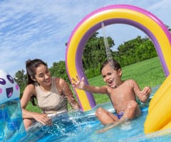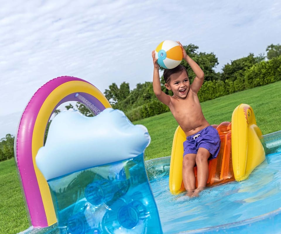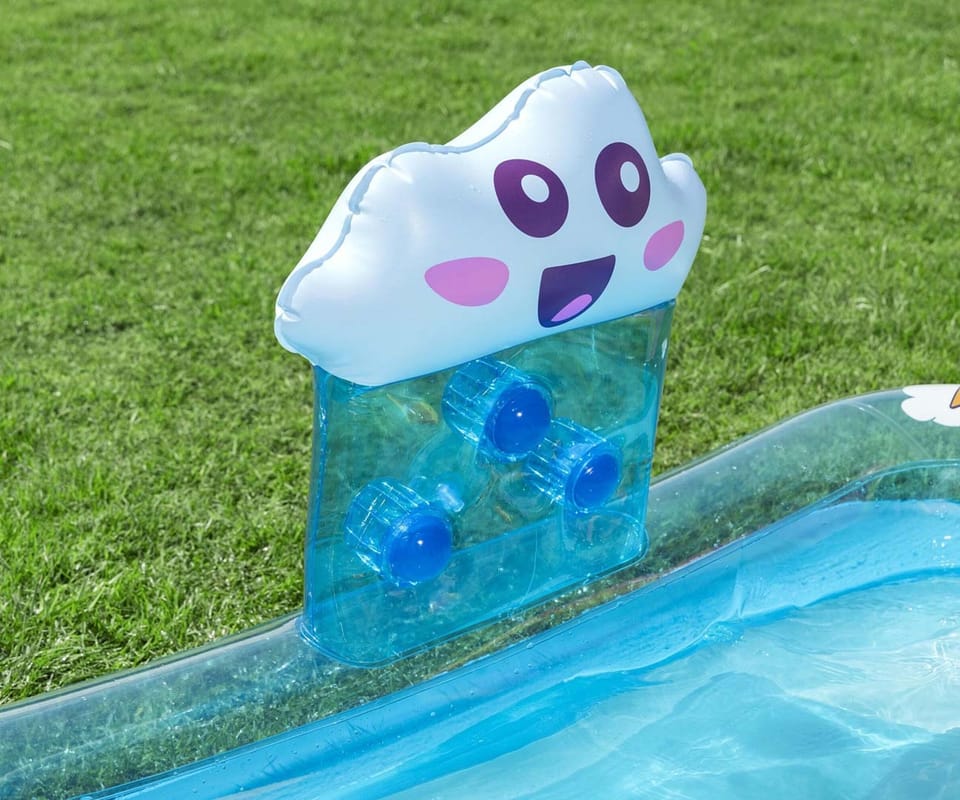 Centrum Zabaw i Basen Bestway® Rainbows ‘N Rays™ 6'2" x 59" x 35"Pozwól swoim dzieciom zanurzyć się w słońcu dzięki Centrum Zabaw Bestway® Rainbows 'N Rays™. W gorące letnie dni dzieci mogą się ochłodzić, przechodząc pod tęczowym zraszaczem łukowym, który można łatwo przymocować do węża ogrodowego. Będą się świetnie bawiły zjeżdżając ze słonecznej zjeżdżalni, która, dla bezpieczeństwa, jest przymocowana do dna basenu. Urocza ściana do sortowania kulek z twarzą chmurą zapewni im wiele godzin zabawy, podczas gdy będą pracowały nad swoimi umiejętnościami motorycznymi, umieszczając 3 piłki do zabawy w otworach w ścianie. Mogą również pracować nad koordynacją ręka-oko, na zmianę rzucając lub odbijając do siebie piłkę plażową. Centrum zabaw posiada również łatwy w użyciu zawór spustowy do odprowadzania wody z basenu, dzięki czemu składanie jest dziecinnie proste; przechowywanie jest łatwe aby móc wykorzystać produkt w przyszłości. Dzieci mogą korzystać z centrum zabaw nawet bez wody, tak aby bawić się nim przez cały rok. Ze swoim maluchem ciesz się większą ilością czasu na świeżym powietrzu dzięki Centrum Zabaw Bestway Rainbows 'N Rays!Pojemność wody: 189 L (50 gal.)Tęczowy łuk ze zraszaczemŚciana do sortowania piłek z uroczą twarzą chmuryZraszacz podłącza się do węża ogrodowegoZawartość: 1 basen, 1 piłka plażowa, 3 piłki do zabawy, łatka naprawczawww.pminvestment.pl/manual/303021367959_PL.pdf
