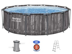 Nie ma nic lepszego niż posiadanie własnego basenu na podwórku! Baseny naziemne Bestway® Steel Pro MAX ™ to wyjątkowo trwała opcja w doskonałej cenie.Trwała konstrukcja:Odporny na korozję stalowy stelaż jest wyposażony w nasz system FrameLink ™ zapewniający solidne i bezpieczne połączenie ramy. Niecka DuraPlus ™ jest wykonana z trwałego materiału, który jest wzmocniony w celu zwiększenia wytrzymałości i odporności na przebicia.Dodatkowe funkcje:Ten naziemny zestaw basenowy jest również wyposażony w pompę filtrującą i drabinkę bezpieczeństwa. Drabinka podnosi się, aby uniemożliwić dostęp do basenu bez nadzoru. Dodatkowo ta pula jest bardzo prosta w konfiguracji i zdejmowaniu do przechowywania poza sezonem. Nie są potrzebne żadne narzędzia, a wąż podłączany jest do wbudowanego zaworu kontroli przepływu, aby szybko i łatwo spuścić wodę z basenu.Spędź lato na wodzie w tym basenie Bestway Steel Pro MAX!Ściany basenu są zbudowane z DuraPlus ™, materiału wzmocnionego rdzeniem z siatki poliestrowej i dwóch warstw PVC o dużej grubości, co zapewnia doskonałą wytrzymałość i trwałośćPojemność wodna (90%): 9150 l (2417 gal.)FrameLink System ™ - formowane na zamówienie trójniki zapobiegają korozji na łączeniu metal-metalŚciana zewnętrzna z nadrukiem drewnianymNadruk Realistic Prismatic Stone ™ zapewnia basenowi piękny wygląd, z teksturą i intensywnym niebieskim kolorem w wewnętrznej części nieckiŁatwy 20 minutowy montażŁatwy do demontażu podczas przygotowywania do przechowywania poza sezonem3-warstwowa taśma zapewnia dodatkowe podparcie burtyOkrągły kształt oznacza łatwy montaż, zwiększoną stabilność i mniej marnowanej przestrzeni.220--240 V ~, natężenie przepływu wody przez pompę 2006 l (530 galonów), natężenie przepływu wody w zintegrowanym systemie basenu 1817 l (480 gal.)Kompatybilny z wkładem 58094 (II)Wbudowany zawór spustowy z kontrolą przepływu łączy się z wężem ogrodowym (z dołączonym adapterem), aby łatwo spuścić wodęBasen jest wyposażony w złącza zapewniające kompatybilność z pompami filtrującymi Flowclear™Zawartość: jeden basen, pompa filtrująca (nr 58383), drabinka zabezpieczająca (nr 58330), kompatybilna z wkładem typu II (nr 58094)Baseny Bestway® Steel Pro MAX ™ oferują opcję wysokiej jakości w przystępnej cenie w porównaniu z innymi basenami naziemnymi dostępnymi na rynku. Mozaika zapewnia atrakcyjny wygląd i nostalgiczny klimat basenu. Montaż to pestka, a właściciele basenu mogą łatwo łączyć elementy stelaża, aż usłyszą kliknięcie. Dzięki wytrzymałej, odpornej na przebicie niecki DuraPlus ™ i odpornemu na korozję stalowemu stelażowi, rodziny mogą cieszyć się basenami Steel Pro MAX przez wiele nadchodzących sezonów. Baseny Steel Pro MAX charakteryzują się wysoką jakością w przystępnej cenie, z elementami wystroju, który będzie kochany przez wielu.Wymiary opakowania:35x44x115Waga:38kg