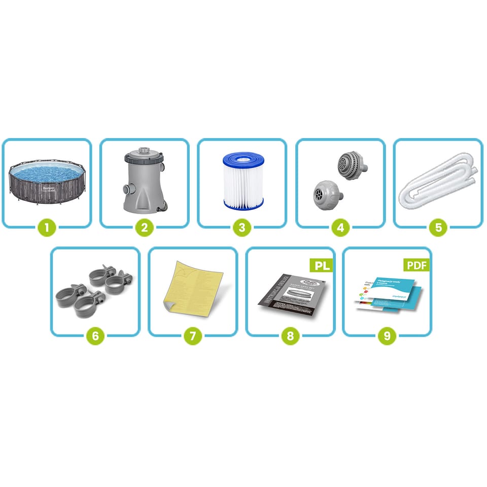 Zawartość: jeden basen, pompa filtrująca (nr 58383), drabinka zabezpieczająca (nr 58330), kompatybilna z wkładem typu II (nr 58094)