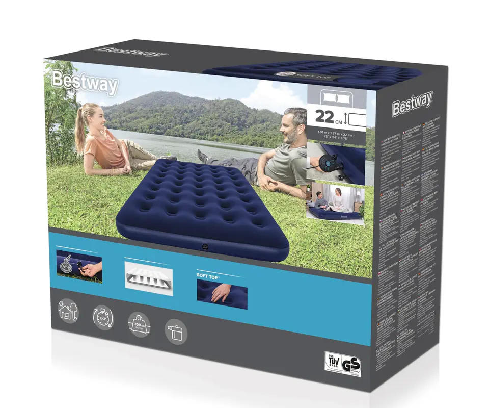 Chwyć idealny materac dmuchany Bestway® na wyprawy kempingowe lub do pokoju gościnnego! Zaprojektowany do użytku wewnątrznego oraz zewnętrznego, jest idealny do wszystkiego, czego potrzebujesz! Pełne łóżko szybko się pompuje i spuszcza powietrze, dzięki czemu jest tak samo wygodne, jak i praktyczne.Trwała konstrukcja: Ten materac dmuchany zapewnia niezbędny komfort snu. Powierzchnia snu przypominająca aksamit jest miękka i ciepła. Wewnętrzne zwoje belki naśladują dotyk standardowego materaca, który jest idealny dla aktywnych śpiących. Zwoje te zapewniają wyprofilowane wsparcie wokół ciebie i mogą szybko reagować na ruch ciała.Prosta instalacja:Aby zapewnić szybkie i wygodne pompowanie, ten zestaw łóżka zawiera podręczną pompę prądu przemiennego PowerTouch™, która podłącza się do standardowego gniazdka domowego. Duży, dwudrożny zawór szybkiego spuszczania zapewnia szybką i łatwą deflację. Po nocy po prostu zwolnij zawór, a powietrze z łóżka spuści się na twoich oczach.Wymiary materaca:- Długość- 191 cm- Szerokość- 137 cm- Wysokość- 22 cm