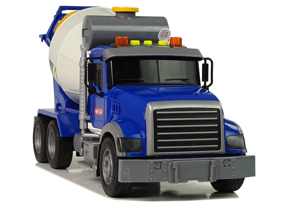 Dodatkowe funkcje jak efekty dźwiękowe i świetlne dodadzą efektu i realizmu całej zabawie. Koguty ostrzegawcze na górze informują o poruszaniu, na górze przyciski odpowiadają za dźwięki- klaksonu, uruchamianie silnika, cofania. Kolorystyka niebieska sprawi, że z daleka autko będzie widoczne. Betoniarka posiada frykcyjny napęd tylnej osi na popych, wystarczy nacisnąć na tył, puścić do przodu i cieszyć się prędkością.