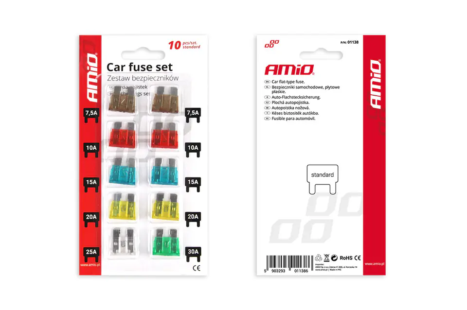 Bezpieczniki samochodowe płytkowe standard zestaw komplet 10 szt. amio-01138