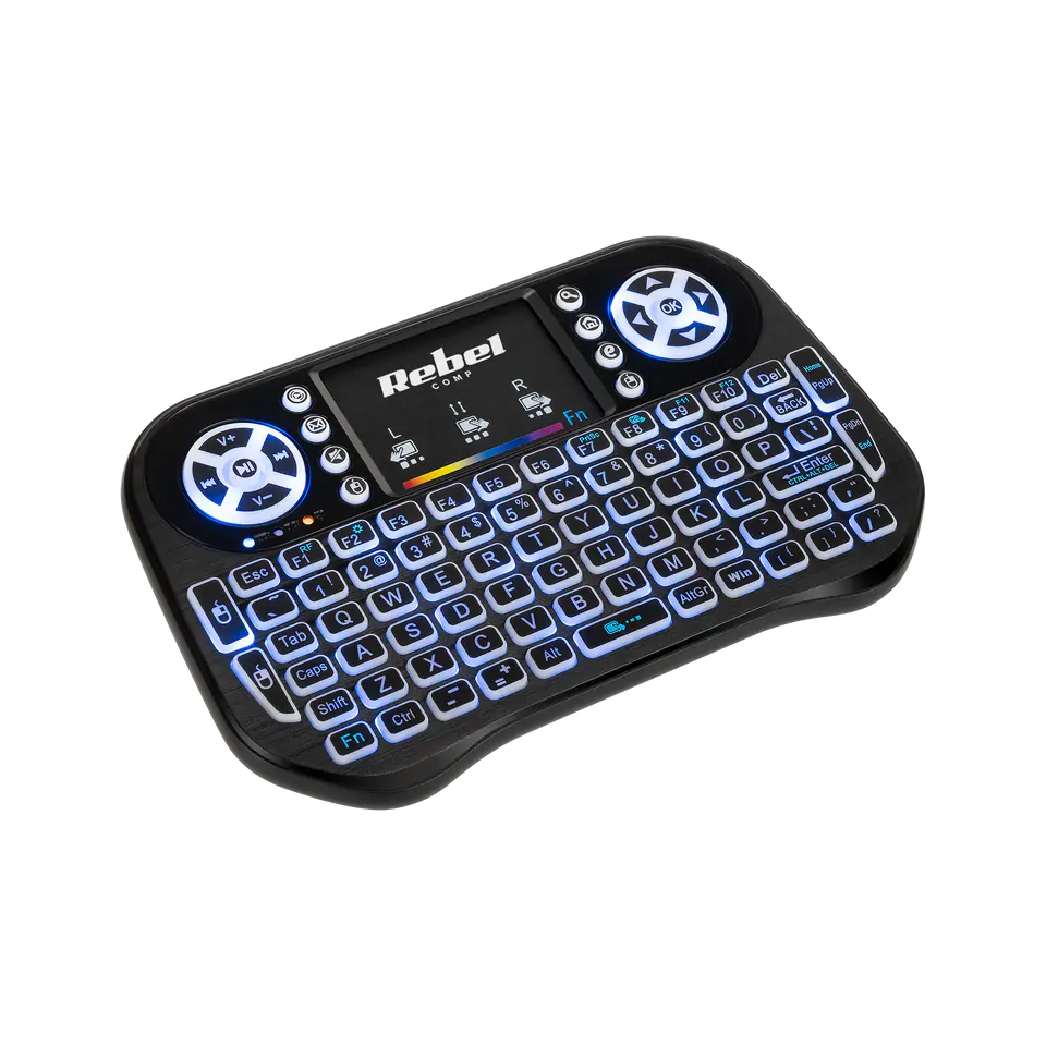Klawiatura bezprzewodowa do Smart TV Rebel Mini Q5 Klawiatura bezprzewodowa Rebel Mini Q5 to doskonały wybór dla każdego, kto ceni sobie funkcjonalność i jakość. Za jej pomocą można wygodnie obsługiwać komputer, np. prowadzić prezentację, pisać, podkreślać słowa oraz swobodnie korzystać ze smart TV. Bezprzewodowe połączenie Zastanawiasz się jak podłączyć klawiaturę bezprzewodową do komputera czy telewizora? Wystarczy niewielki odbiornik, by z odległości nawet 10 metrów komfortowo obsługiwać telewizor, rzutnik czy laptop. Mini klawiatura bezprzewodowa KOM0973 to elegancka i wygodna w użyciu kompaktowa klawiatura bezprzewodowa kompatybilna z systemem Windows, Windows Mobile, Android, Linux i macOS. Dzięki swojej funkcjonalności doskonale się sprawdzi do zarządzania Smart TV, wysyłania wiadomości e-mail, czatowania i grania. Podświetlenie Rebel Mini Q5 to podświetlana klawiatura bezprzewodowa, dzięki czemu możesz swobodnie używać jej także nocą. Poza standardowymi przyciskami urządzenie posiada dodatkowe klawisze, które zapewniają szybkie przejście do poczty e-mail czy regulacja głośności. Klawiatura bezprzewodowa z touchpadem Rebel Mini Q5 to klawiatura i mysz bezprzewodowa w jednym. Wbudowany touchpad pozwala na intuicyjne przewijanie w pionie i w poziomie, dzięki czemu nawigacja w menu staje się dziecinnie prosta.