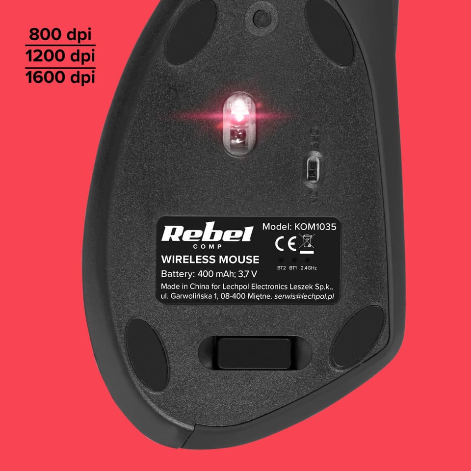 ----------Parametry techniczne----------Rozdzielczość pracy: 800/1200/1600 dpiRodzaj sensora: laserowyModel sensora: 8650Odświeżanie USB: 125 HzIlość przycisków: 6Rolka: przewijanie + przyciskPrzełącznik DPI: 3 trybyTrwałość przycisków: do 3 milionów kliknięćŚlizgacze: PVCMateriał: ABSBateria: 400 mAh; 3,7 VW zestawie: kabel USB-C----------Komunikacja----------Komunikacja z komputerem: bezprzewodowaZakres częstotliwości Bluetooth: 2402 MHz ~ 2480 MHzMaks. moc wyjściowa Bluetooth: 1 dBmInterfejs: USB 2.0Port ładowania: USB typu CObsługiwane systemy operacyjne: Windows 2000 / Windows XP / Windows CE / Windows 7 / Windows 10 / Linux / Android----------Parametry fizyczne----------Profil myszy: praworęcznaWaga: 102 gWymiary: 126 x 68 x 74,8 mm