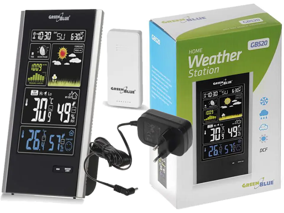Bezprzewodowa stacja pogody z DCF i funkcją drzemki. Duży, czytelny kolorowy ekran wyświetla jednocześnie temperaturę wewnątrz i na zewnątrz. Wyświetla fazy księżyca, oraz ciśnienie powietrza, informacje na temat temperatury i wilgotności oraz przebieg ciśnienia.